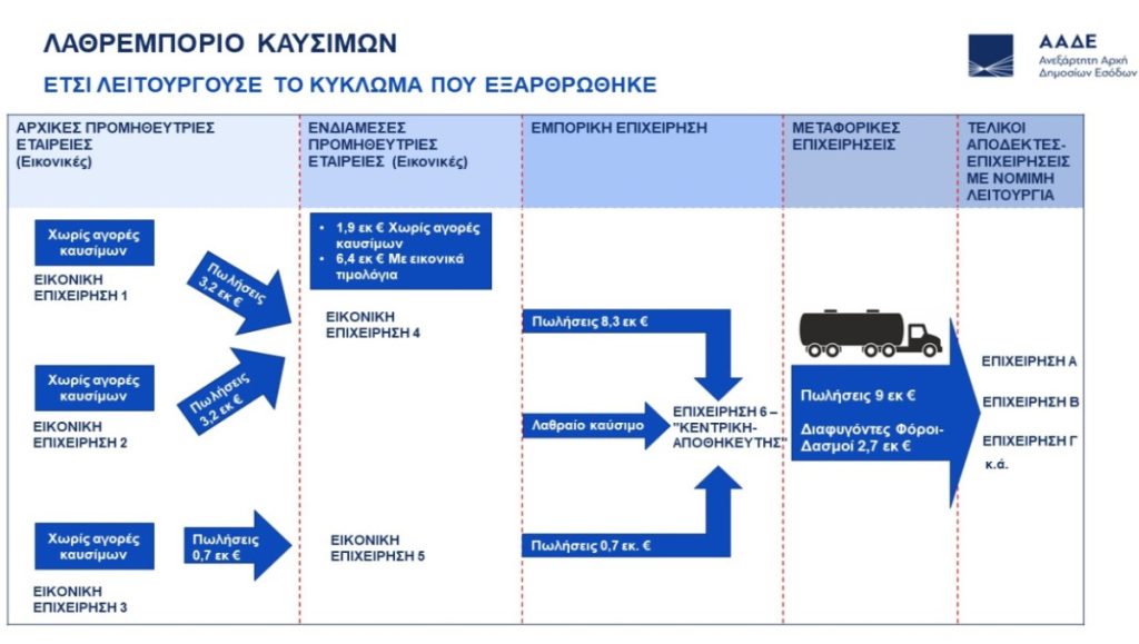 Ένα πολυμελές και καλά οργανωμένο δίκτυο εταιρειών –βιτρινών, που διοχέτευε, συστηματικά, λαθραία καύσιμα στην αγορά, έφεραν στο φως οι ελεγκτές της Ανεξάρτητης Αρχής Δημοσίων Εσόδων.