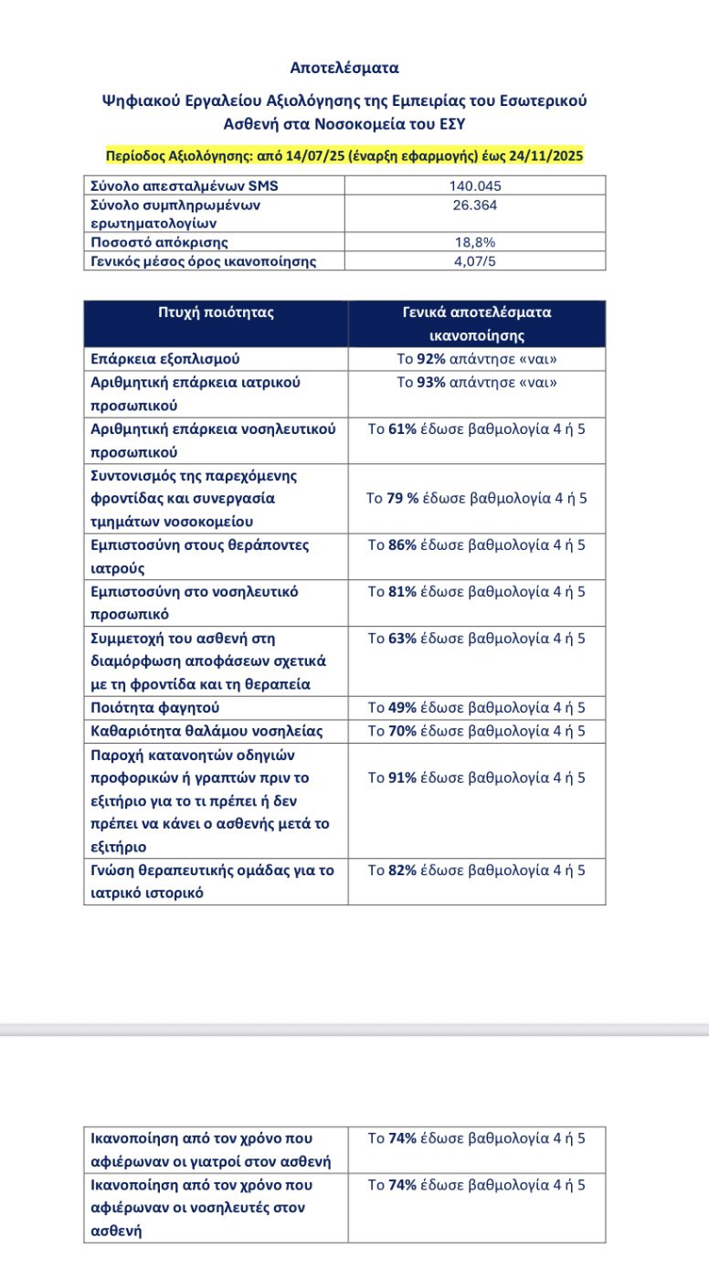 Δείτε μόνοι σας τα συγκεντρωτικά αποτελέσματα του εργαλείου της αυτοαξιολόγησης από τους ίδιους τους χρήστες του ΕΣΥ. Έχουμε ήδη βαθμολογία από πραγματικούς 26:364 ασθενείς, που μας απάντησαν αφού έλαβαν εξιτήριο. Γενικός μέσος όρος ικανοποίησης 4,07/5 …αυτό ειναι το «ΕΣΥ που… pic.twitter.com/9YHJzVwl1W