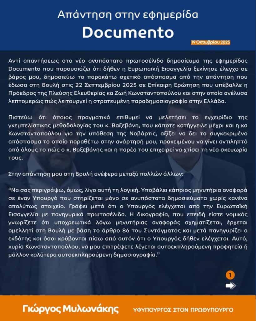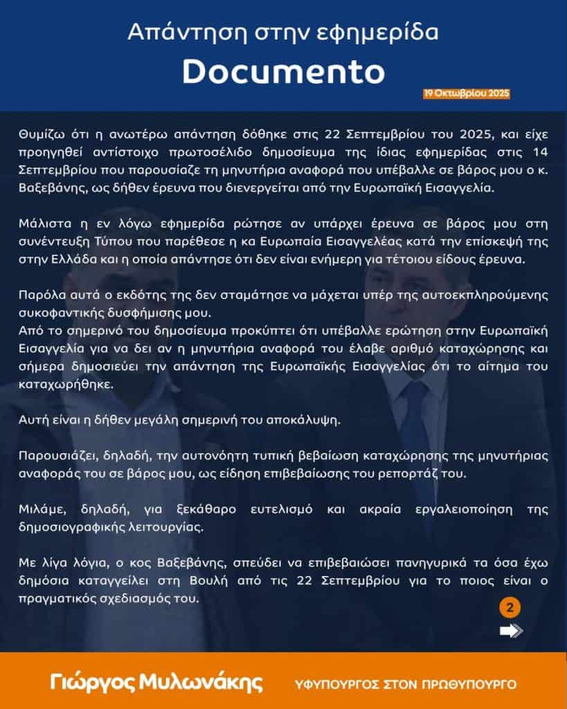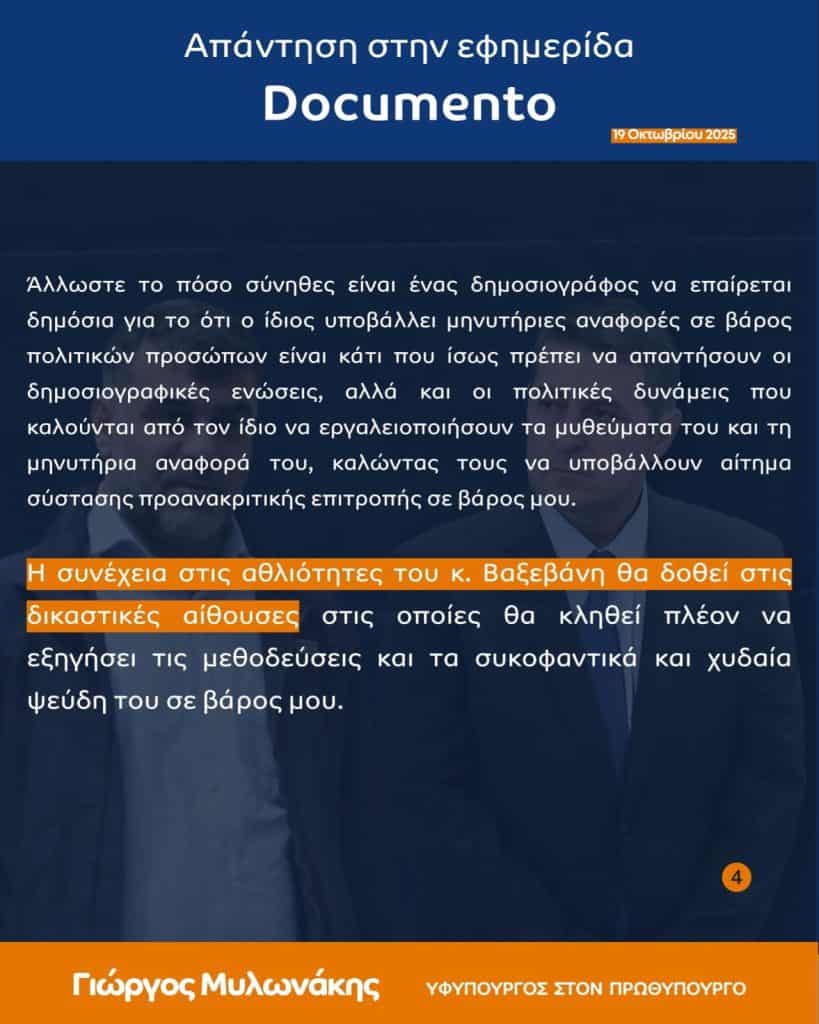 Σκληρή απάντηση σε δημοσίευμα της εφημερίδας Documento έδωσε ο υφυπουργός στον Πρωθυπουργό Γιώργος Μυλωνάκης τόνιζοντας ότι «συνέχεια στις αθλιότητες του κ. Βαξεβάνη θα δοθεί στις δικαστικές αίθουσες στις οποίες θα κληθεί πλέον να εξηγήσει τις μεθοδεύσεις, τα συκοφαντικά και χυδαία ψεύδη του σε βάρος μου».