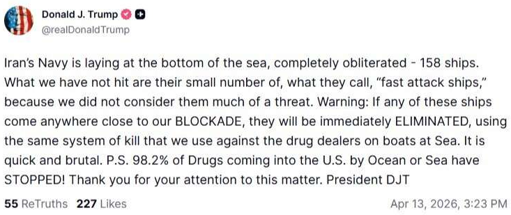 «Το Πολεμικό Ναυτικό του Ιράν κείτεται στον βυθό της θάλασσας εντελώς κατεστραμμένο- 158 πλοία. Αυτό που δεν έχουμε πλήξει είναι ο μικρός αριθμός αυτών που αποκαλούν ‘πλοία ταχείας επίθεσης’ διότι δεν θα θεωρούσαμε σοβαρή απειλή», έγραψε ο Τραμπ σε ανάρτησή του στο Truth Social.
