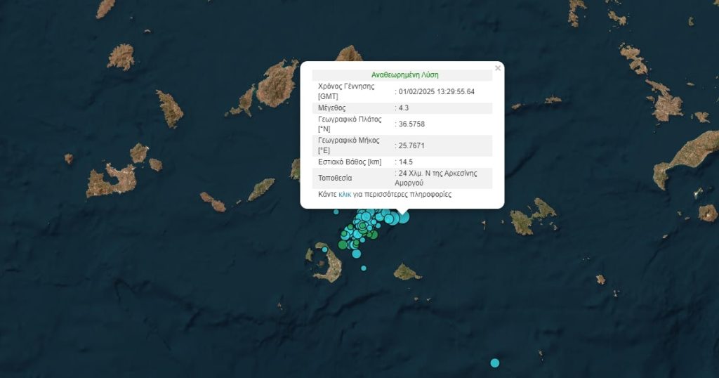 Στις 12.16 καταγράφηκε σεισμική δόνηση 3,9 Ρίχτερ, 21 χλμ. νότια-νοτιοδυτικά της Αμοργού. Αμέσως μετά στις 12.26 καταγράφηκε στο ίδιο σημείο δόνηση 3,2 Ρίχτερ και στις 12.44 ακόμη μια δόνηση μεγέθους 3,1.
