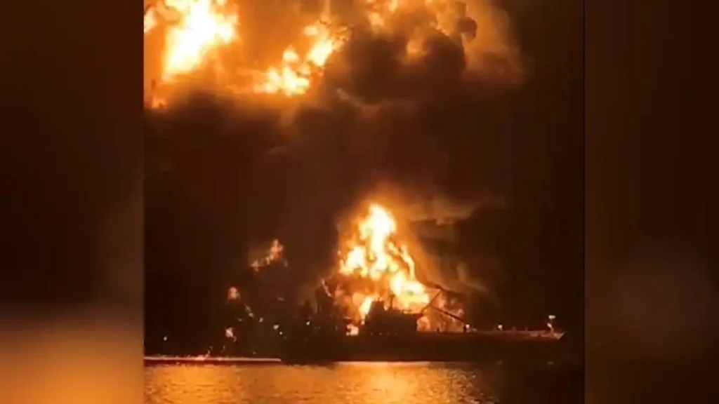 Συγκλονιστικό βίντεο δείχνει τη στιγμή που το ελληνόκτητο τάνκερ “Zephyros” με σημαία Μάλτας είναι τυλιγμένο στις φλόγες έπειτα από το πλήγμα που δέχθηκε πιθανότα από ιρανικό μη επανδρωμένο επιφανειακό σκάφος κατά τη διάρκεια της νύχτας (12/3)