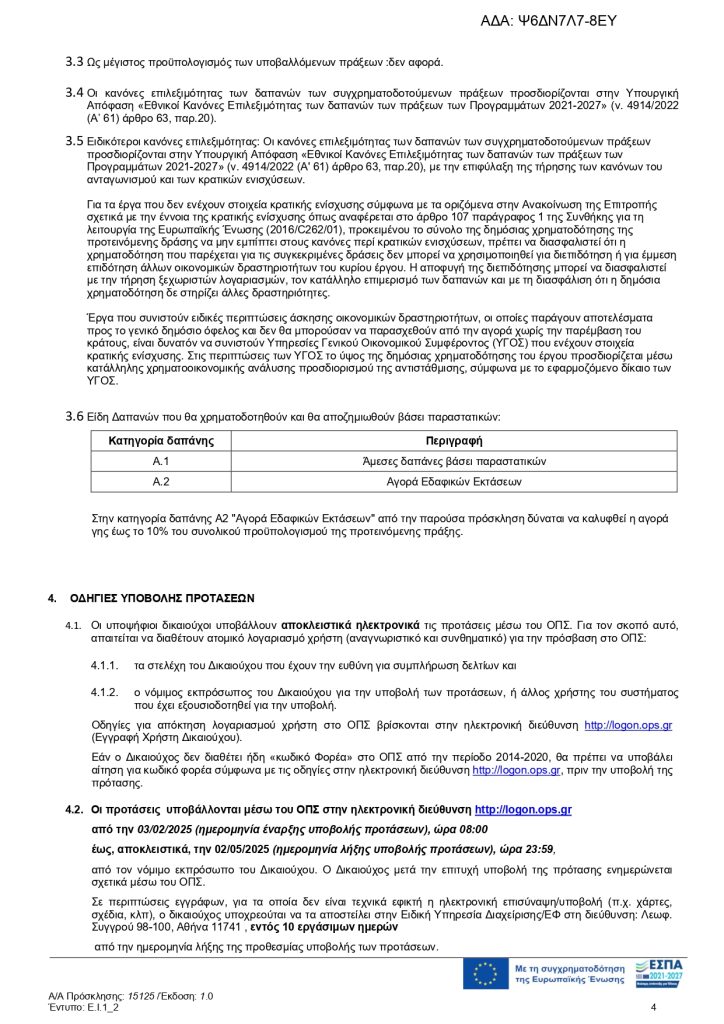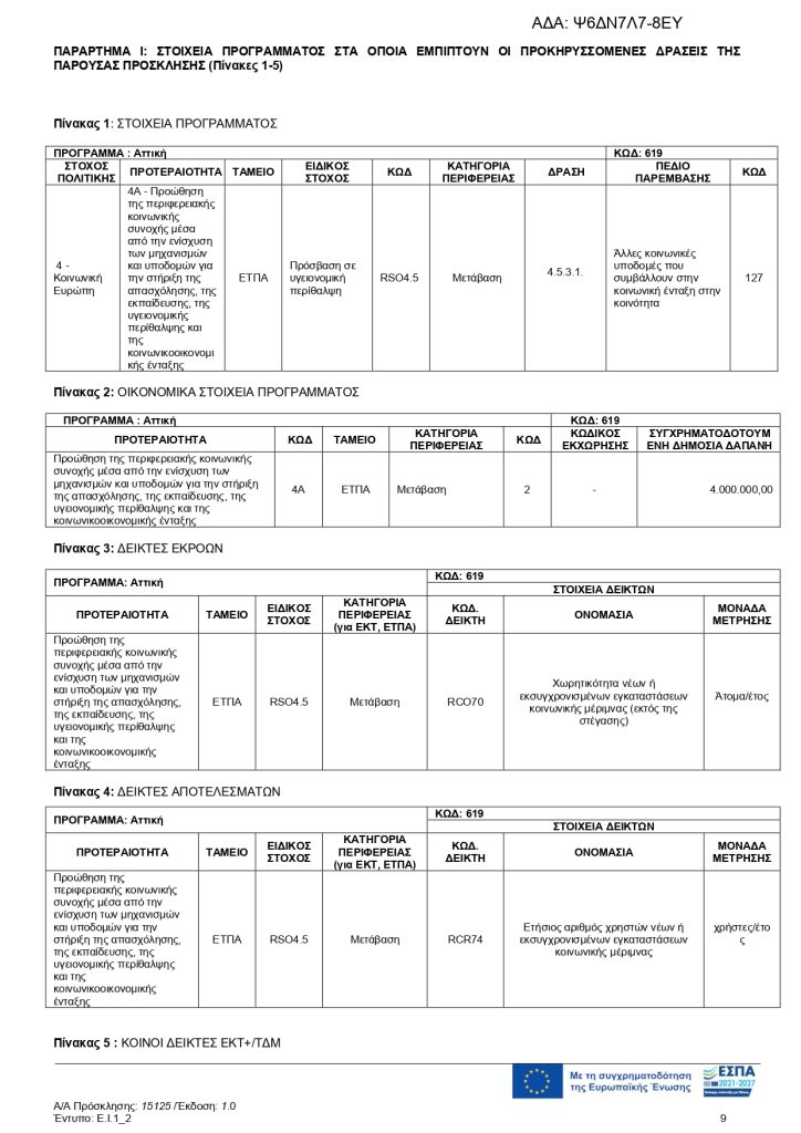 Ο συνολικός προϋπολογισμός της πρόσκλησης ανέρχεται στα 4 εκατ. ευρώ, με δυνατότητα ένταξης πράξεων (έργων) μέχρι του ποσού των 7,2 εκατ. ευρώ, με συγχρηματοδότηση από το Ευρωπαϊκό Ταμείο Περιφερειακής Ανάπτυξης (ΕΤΠΑ).