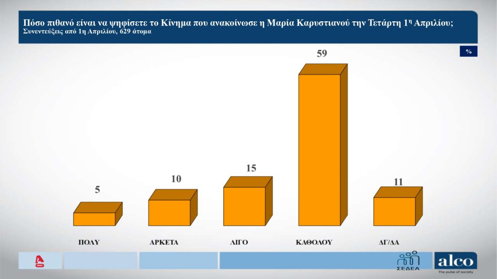 Στην πιθανότητα να ψηφίσουν ένα κόμμα Καρυστιανού, το θετικό ποσοστό φτάνει στο 15%, στη… μέση είναι ένα άλλο 15%, ενώ «λίγο» ή «καθόλου» πιθανό είναι στο 74% σε μια πρώτη εκτίμηση μετά την ανακοίνωση του κόμματός της.