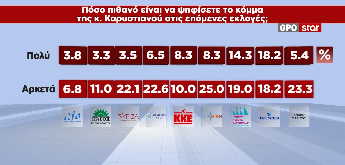 Μεγαλύτερη διείσδυση φαίνεται να έχει η Μ. Καρυστιανού στη Φωνή Λογικής, στην Πλεύση Ελευθερίας, στη Νίκη, στην Ελληνική Λύση και στους αναποφάσιστους.