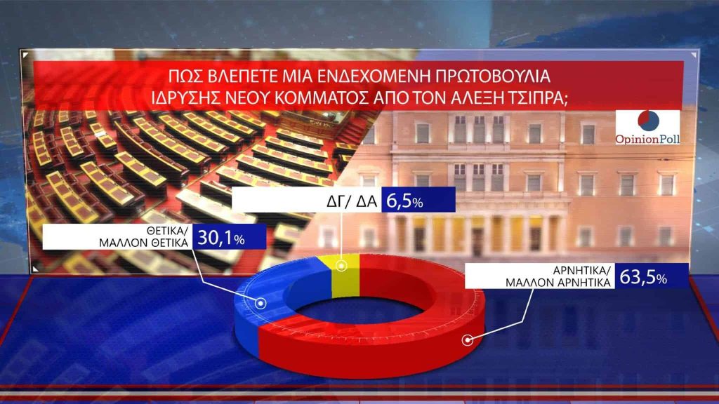 Το 63,5% των πολιτών βλέπει αρνητικά ή μάλλον αρνητικά την πρωτοβουλία του Αλέξη Τσίπρα για ίδρυση νέου κόμματος. Το ίδιο πιστεύει το 44,3% των αριστερών και το 41,3% των κεντροαριστερών ψηφοφόρων. Μόλις το 6,5% δηλώνει ότι θα το ψήφιζε σίγουρα, ενώ σχεδόν 7 στους 10 πιστεύουν ότι δεν μπορεί να αντιμετωπίσει νικηφόρα τον Κυριάκο Μητσοτάκη στις επόμενες εκλογές.