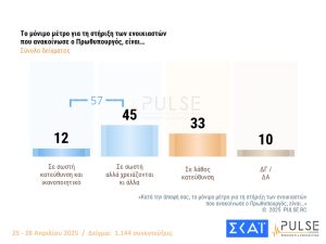 Πλοήγηση άρθρων Δημοσκόπηση Pulse για τον ΣΚΑΪ: Πρώτη και με διαφορά η ΝΔ – Συνεχίζει την ανοδική της πορεία – Ο κόσμος δέχτηκε θετικά τα νέα μέτρα Μητσοτάκη