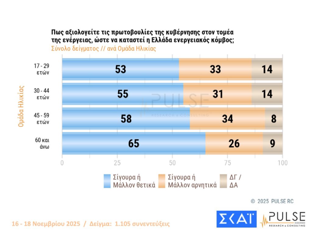 Σε όλες τις ηλικιακές ομάδες υπάρχει αποδοχή άνω του 50% για τις πρωτοβουλίες της κυβέρνησης στον τομέα της ενέργειας ώστε να καταστεί η Ελλάδα ενεργειακός κόμβος – στο σύνολο φτάνει το 59% – ενώ μόνον στην κατηγορία εκείνων που αυτοχαρακτηρίζονται «αριστεροί» η αποδοχή είναι μειοψηφική, στο 31%.