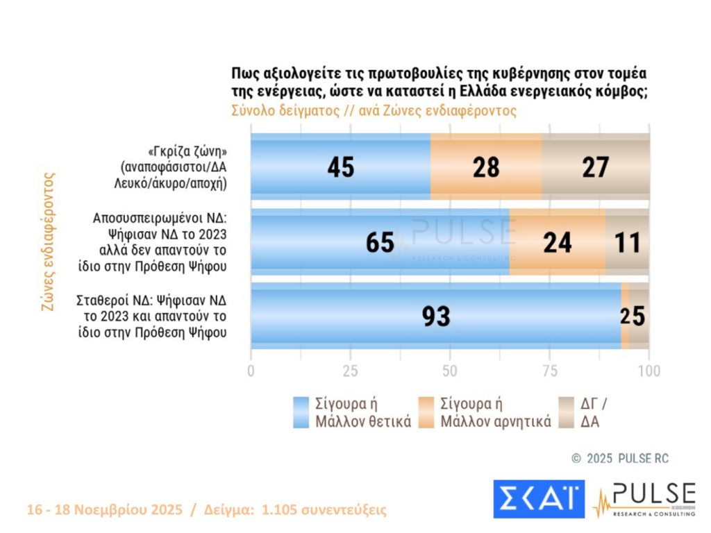 Η ΝΔ συνεχίσει την ανοδική της πορεία και μάλιστα έχει πάρει ώθηση και από τις πρόσφατες τεράστιες ενεργειακές συμφωνίες της κυβέρνσης, Η δημοσκόπηση της Pulse που παρουσιάστηκε απόψε (20.11.2025) στο κεντρικό δελτίο ειδήσεων του ΣΚΑΪ το απέδειξε αυτό και έδειξε και πάλι ότι η ΝΔ δεν έχει αντίπαλο στο πολιτικό σκηνικό.
