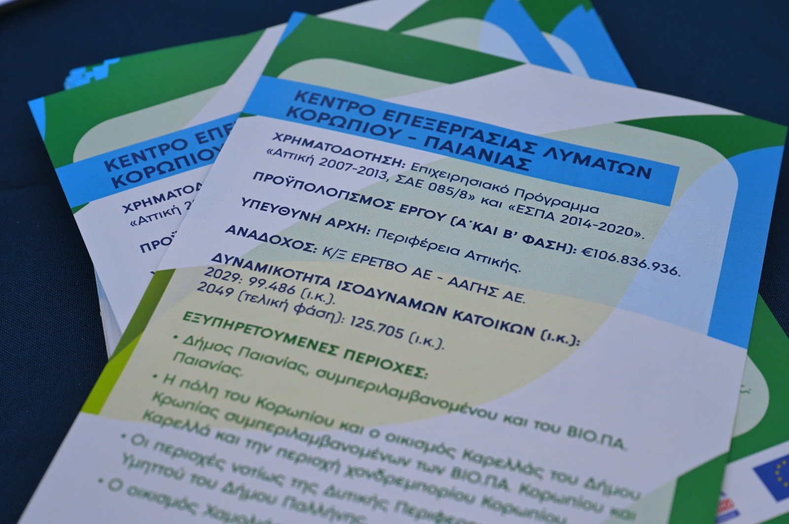 Επισημαίνεται πως συνολικά τα έργα αποχέτευσης και επεξεργασίας λυμάτων σε όλη την Ανατολική Αττική, είναι προϋπολογισμού 420 εκ. ευρώ από πόρους δύο Ταμείων του ΕΣΠΑ 2014-2020 (Ταμείο Συνοχής και Ευρωπαϊκό Ταμείο Περιφερειακής Ανάπτυξης) – ποσό που, μαζί με το ΚΕΛ Κορωπίου – Παιανίας, υπερβαίνει το μισό δις ευρώ.