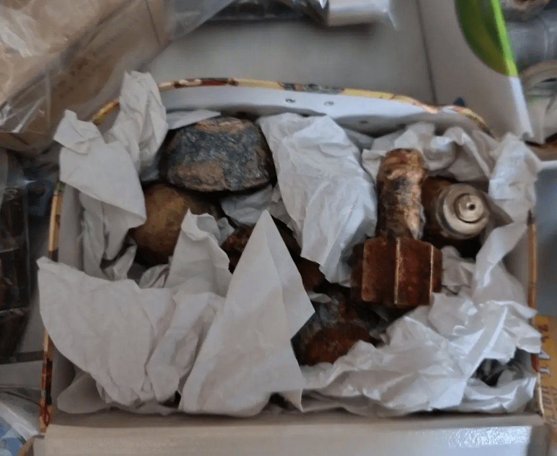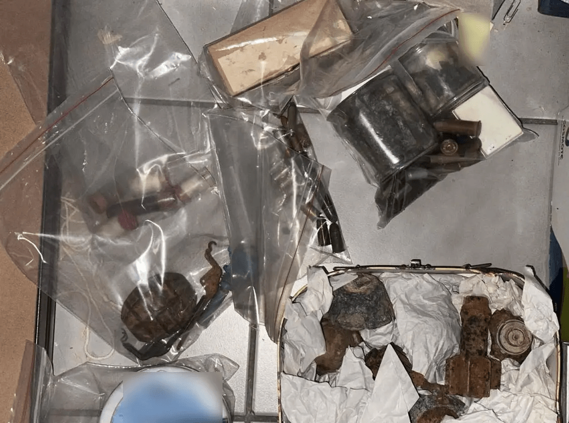 Μεταξύ των πυρομαχικών που εντοπίστηκαν ήταν κλείστρα από διάφορα όπλα του Β’ παγκοσμίου πολέμου, δύο οξειδωμένοι μοχλοί απελευθέρωσης χειροβομβίδας, μια αμυντική χειροβομβίδα, διάφορα οξειδωμένα εξαρτήματα από όπλα, φυσίγγια διαφόρων διαμετρημάτων, δύο σιδερογροθιές, ένα ζευγάρι χειροπέδες, δύο πτυσσόμενα γκλομπ και 14 θρησκευτικές εικόνες.