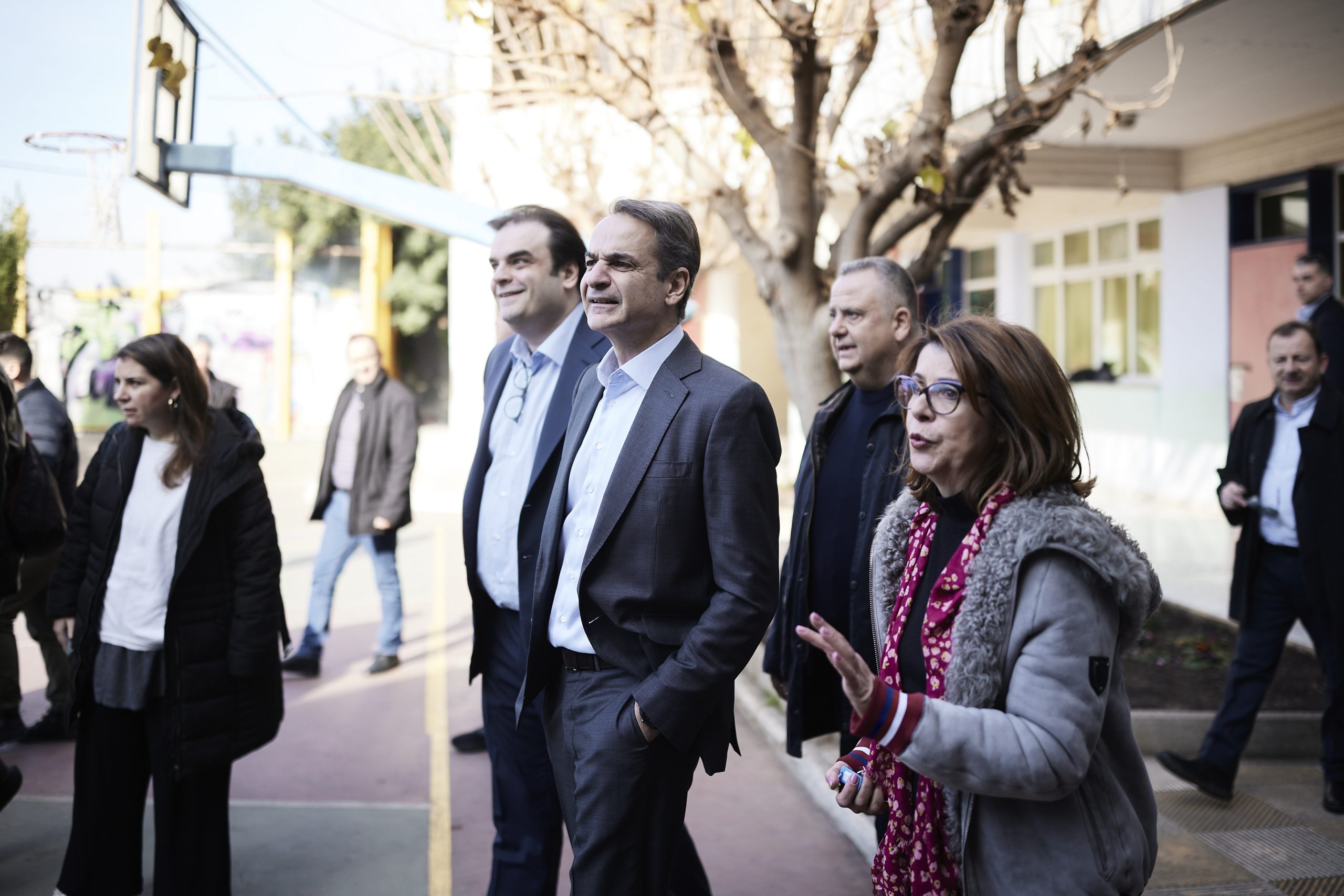 Ο Πρωθυπουργός, συνοδευόμενος από τον Υπουργό Παιδείας, Θρησκευμάτων και Αθλητισμού Κυριάκο Πιερρακάκη και τον Δήμαρχο Νέας Φιλαδέλφειας – Νέας Χαλκηδόνας Γιάννη Τομπούλογλου, είχε την ευκαιρία να ενημερωθεί από τη Διευθύντρια του σχολείου Σοφία Αποστολοπούλου για τις εργασίες που χρειάζεται να γίνουν στις τάξεις, στους κοινόχρηστους χώρους, τους χώρους άθλησης και στην αίθουσα εκδηλώσεων του σχολείου.