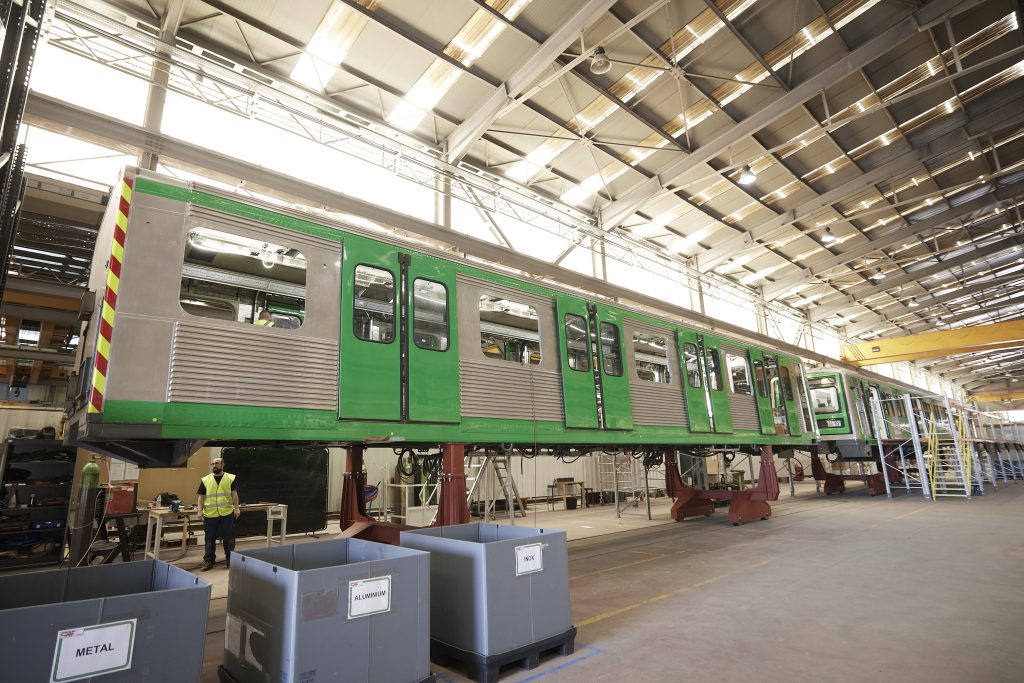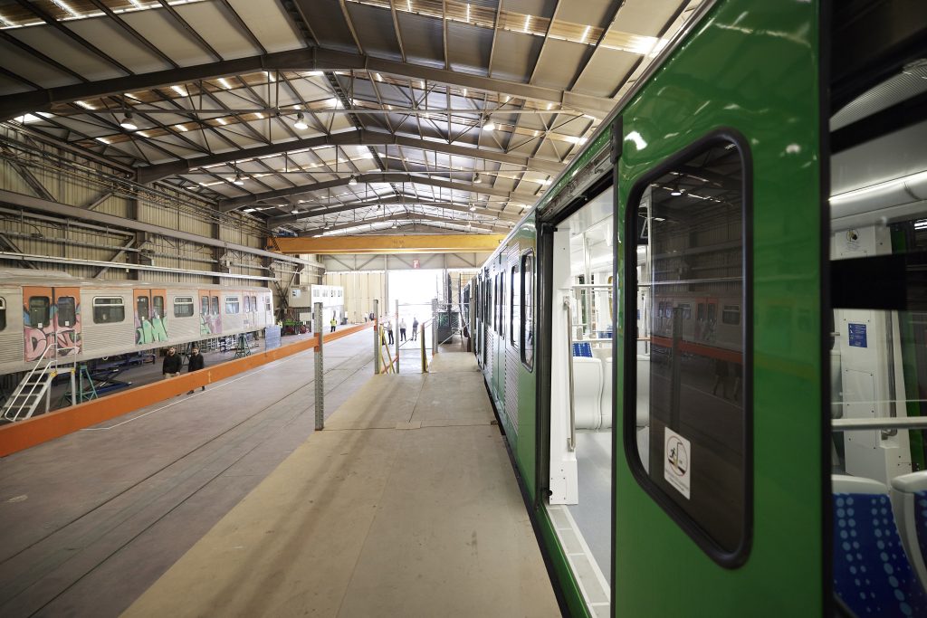 Εδώ πίσω μας έχουμε το πρώτο βαγόνι το οποίο έχει ήδη ανακαινιστεί, και εσωτερικά και εξωτερικά, και ο εξοπλισμός του, τα συστήματα ασφαλείας, αλλά και ο εσωτερικός εξοπλισμός, θέσεις ΑμεΑ, ευρύχωρα, αντι-γκράφιτι, όλα αυτά τα οποία χρειάζεται μία σύγχρονη γραμμή για να εξυπηρετήσει με ασφάλεια και με άνεση τους επιβάτες της Γραμμής 1».