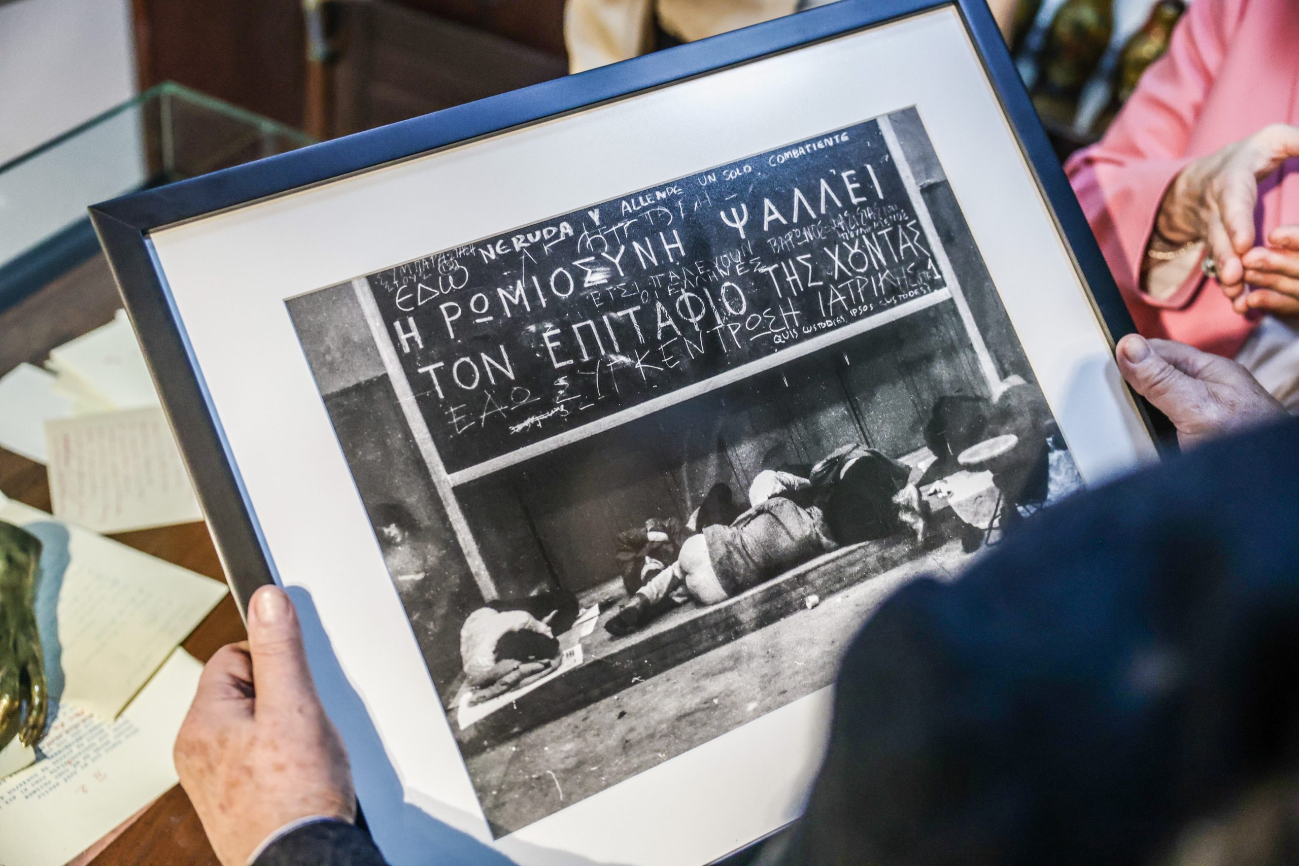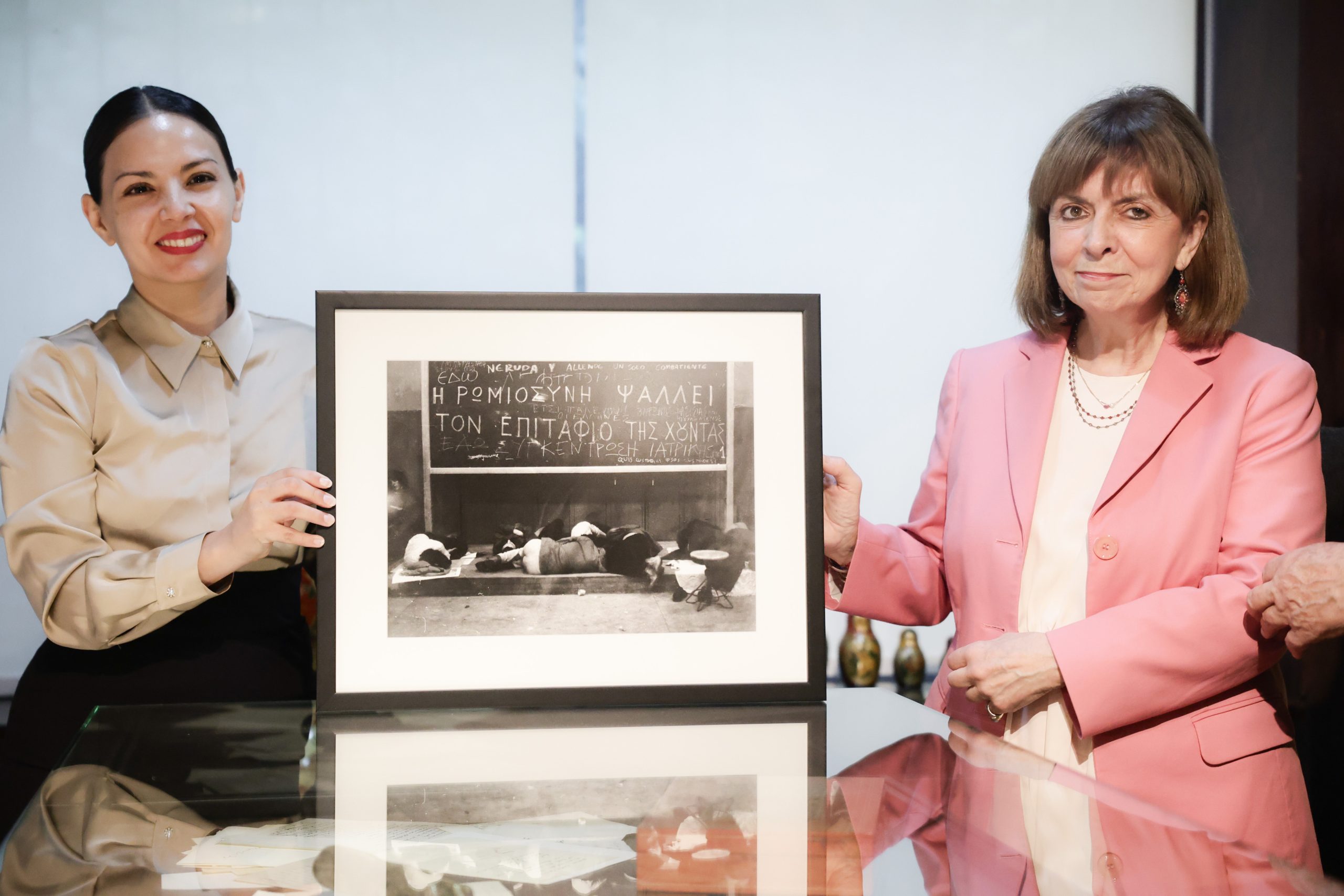 Η πρόεδρος δώρισε στο μουσείο μια ιστορική φωτογραφία από το Αρχείο Αντιδικτατορικής Νεολαίας του Μανώλη Νταλούκα, στην οποία απεικονίζονται φοιτητές να κοιμούνται σε αίθουσα του Πολυτεχνείου, μία από τις βραδιές της κατάληψης, το 1973, ενώ στον πίνακα πίσω τους είναι γραμμένα τα ονόματα του Salvador Allende και του Pablo Neruda.