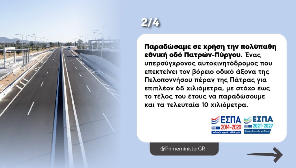 Ένα από τα πλέον εμβληματικά έργα υποδομών που εκκρεμούσε εδώ και δεκαετίες, επιτέλους παραδόθηκε από αυτήν την κυβέρνηση. Αναφέρομαι φυσικά στην πολύπαθη εθνική οδό Πατρών-Πύργου. Πλέον, μιλάμε για έναν υπερσύγχρονο αυτοκινητόδρομο που επεκτείνει τον βόρειο οδικό άξονα της Πελοποννήσου πέραν της Πάτρας για επιπλέον 65 χιλιόμετρα, με στόχο έως το τέλος του έτους να παραδώσουμε και τα τελευταία 10 χιλιόμετρα. Πρόκειται για ένα έργο που ξεκίνησε αρχικά το 2007, χωρίς καμία πραγματική πρόοδο μέχρι όταν αναλάβαμε τη διακυβέρνηση της χώρας το 2019. Η κατάτμηση του έργου είχε οδηγήσει σε αδιέξοδο και αποφασίσαμε να το επανασχεδιάσουμε, υλοποιώντας το ως έναν ενιαίο, σύγχρονο αυτοκινητόδρομο. Η παλαιά Πατρών-Πύργου δεν ήταν απλώς ένας κακός δρόμος. Ήταν ένας από τους πιο θανατηφόρους της πατρίδας μας. Μόνο την περίοδο 2016-2020 χάθηκαν εκεί 56 ζωές. Και από το 2021 έως σήμερα, άλλοι 25 συνάνθρωποί μας. Επιτρέψτε μου να πω ότι η ολοκλήρωση του έργου αποτελεί έναν ελάχιστο φόρος τιμής σε όσους χάθηκαν άδικα σε αυτόν τον δρόμο. Κάναμε το αυτονόητο. Και θα συνεχίσουμε να το κάνουμε, όπου δεν έχει γίνει.