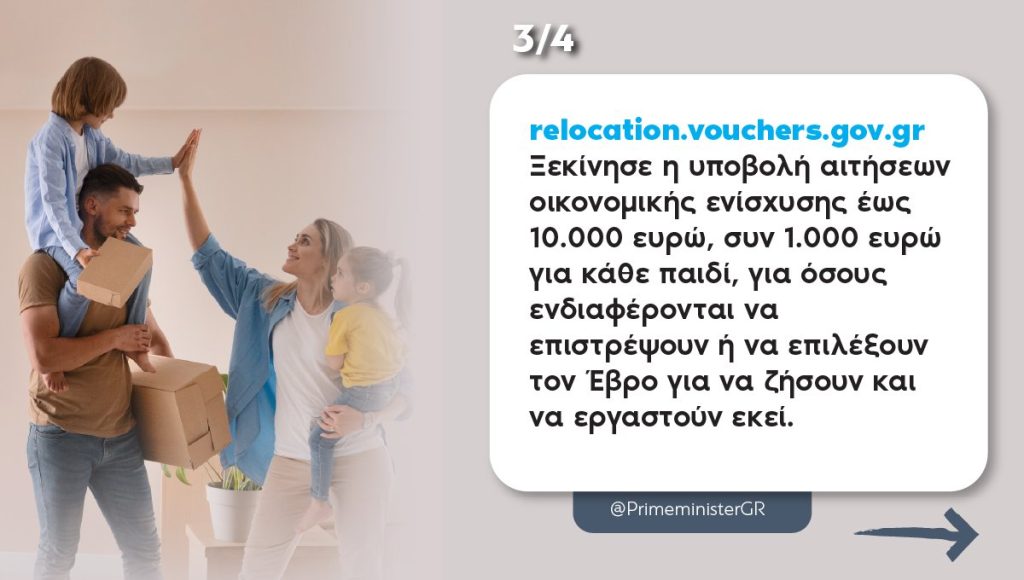 Από την Ηλεία και το δυτικό άκρο της χώρας μας, σας μεταφέρω στον βορρά και την ανατολικότερη μας περιφέρεια, τον αγαπημένο μας Έβρο. Το λέω όπως το νιώθω: για να είμαστε όλοι οι υπόλοιποι ασφαλείς, πρέπει πρώτα και κύρια να αισθάνονται ασφαλείς και να νιώθουν αισιόδοξοι οι Εβρίτες μας. Γι’ αυτό και με απασχολεί συνεχώς το ζήτημα της δημογραφικής συρρίκνωσης, ειδικά του βορείου Έβρου. Άνοιξε, λοιπόν, στο relocation.vouchers.gov.gr το σύστημα υποβολής αιτήσεων οικονομικής ενίσχυσης έως 10.000 ευρώ, συν 1.000 ευρώ για κάθε παιδί, για όσους πολίτες ενδιαφέρονται να επιστρέψουν ή να επιλέξουν τον Έβρο για να ζήσουν, να εργαστούν και να δημιουργήσουν εκεί. Προφανώς, δεν αρκεί ένα επίδομα για να αναστρέψουμε τη δημογραφική συρρίκνωση της περιοχής, γι’ αυτό και το σχέδιό μας πλαισιώνεται από παρεμβάσεις όπως η ενδυνάμωση του Δημοκρίτειου Πανεπιστημίου με νέα τμήματα στην περιοχή, η πύκνωση του σιδηροδρομικού μας δικτύου, αλλά και ενισχυμένα κίνητρα για τους δημοσίους υπαλλήλους. Επιπλέον, λειτουργούν Κινητές Ομάδες Υγείας για τις απομακρυσμένες κοινότητες, ενώ η επέκταση του φράκτη συνεχίζεται ως αποτελεσματικό ανάχωμα στις παράνομες μεταναστευτικές ροές. Παράλληλα, προωθούμε νέες δράσεις απασχόλησης και επιχειρηματικότητας, ειδικά προγράμματα κινήτρων για νέες επενδύσεις, αλλά και τη μείωση του μεταφορικού κόστους των επιχειρήσεων του Έβρου. Στο πλαίσιο αυτό, το επόμενο διάστημα θα ανακοινώσουμε επιδότηση για έως και τρία χρόνια σε κυκλική εβδομαδιαία ακτοπλοϊκή σύνδεση με τον Πειραιά, που θα περιλαμβάνει ενδιάμεσες στάσεις σε Χίο και Μυτιλήνη. Θέλουμε μια Ελλάδα με όλους, για όλους. Αυτή είναι η Εθνική Στρατηγική μας για την Περιφερειακή και Τοπική Ανάπτυξη. Αυτό είναι το όραμά μας και δεν μπορεί να απουσιάζει από αυτό η διαρκής μέριμνα για τους ακρίτες του Έβρου μας.