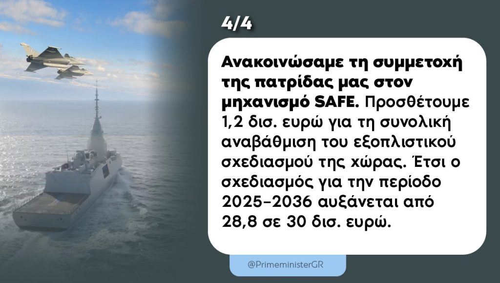 Και από τη θωράκιση της κοινωνίας με μέτρα κοινωνικής συνοχής να περάσω στη θωράκιση της εθνικής μας άμυνας. Η Ελλάδα κατέθεσε σχέδιο συμμετοχής στο νέο ευρωπαϊκό πρόγραμμα SAFE, διεκδικώντας χρηματοδότηση ύψους 1,2 δισ. ευρώ για την ενίσχυση του εξοπλιστικού μας σχεδιασμού. Πρόκειται για ένα νέο εργαλείο της ΕΕ που στηρίζει τα κράτη-μέλη που επενδύουν στρατηγικά στην άμυνά τους. Έτσι, ο εξοπλιστικός σχεδιασμός της πατρίδας μας για την περίοδο 2025–2036 αυξάνεται από 28,8 σε 30 δισ. ευρώ, ενώ οι ετήσιες παραλαβές εξοπλισμού θα ενισχυθούν από 2,3 δισ. ευρώ το 2026 σε περίπου 2,6 δισ. ευρώ από το 2028 και μετά. Τα νούμερα αυτά δεν είναι απλώς αριθμοί στον προϋπολογισμό. Είναι πρόσθετη αποτρεπτική ισχύς για τη χώρα μας. Είναι ανάπτυξη για την ελληνική αμυντική βιομηχανία. Είναι νέες θέσεις εργασίας, μεταφορά τεχνογνωσίας, παραγωγική επανεκκίνηση σε κρίσιμους τομείς. Η άμυνα για εμάς, δεν είναι ούτε τεχνοκρατική επιλογή, ούτε λογιστική εγγραφή. Είναι πάνω απ’ όλα εθνική υπόθεση. Είναι βαθιά ριζωμένη στη συνείδηση του ελληνικού λαού ως καθήκον και ως προτεραιότητα εθνικής επιβίωσης. Η κυβέρνηση αντιμετωπίζει την ενίσχυση της άμυνας ως στρατηγική επιλογή πρώτης γραμμής. Γιατί δεν υπάρχει ισχυρή άμυνα χωρίς κοινωνική συνοχή. Και αντιστρόφως, δεν υπάρχει κοινωνική πρόοδος χωρίς ασφάλεια και σταθερότητα.