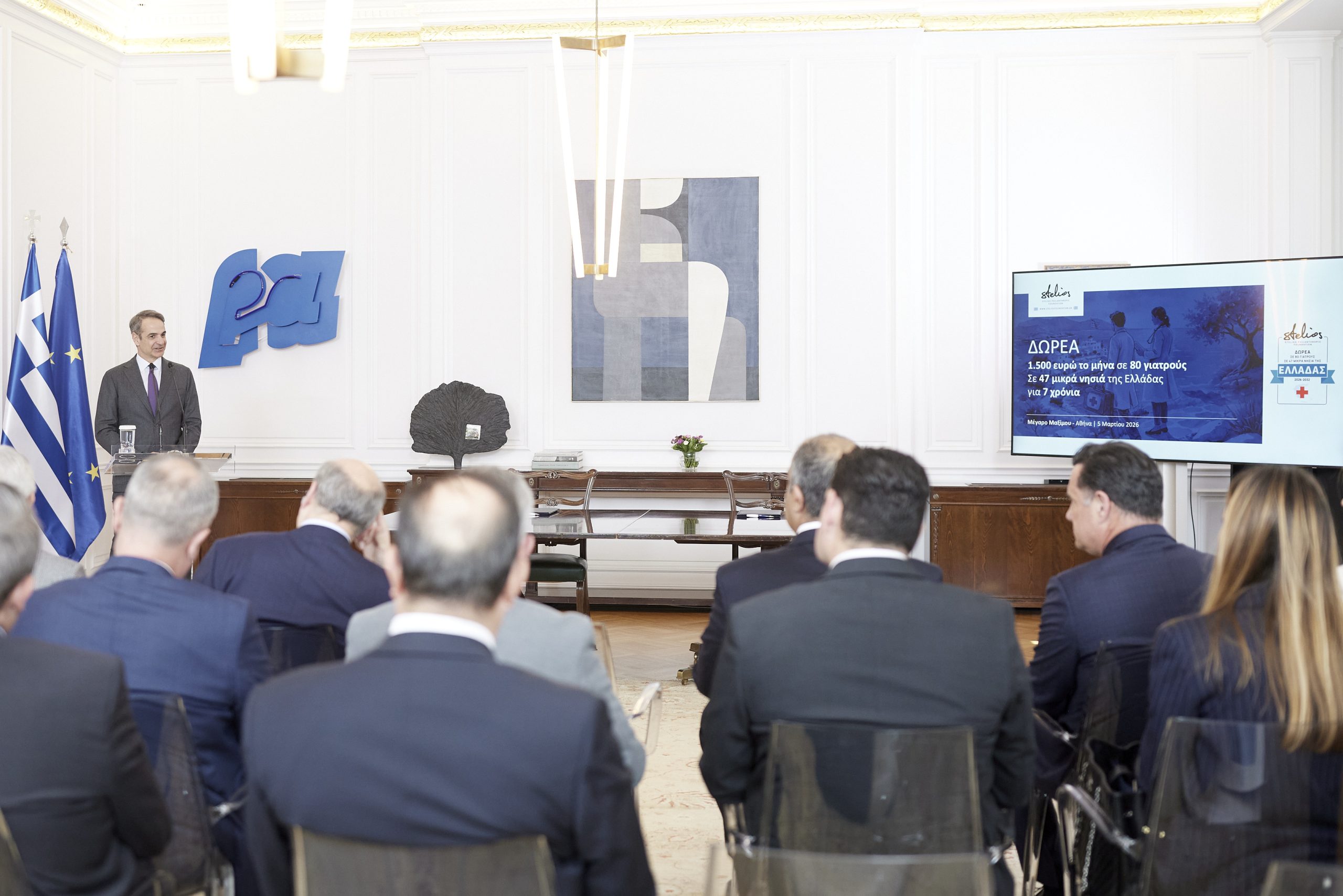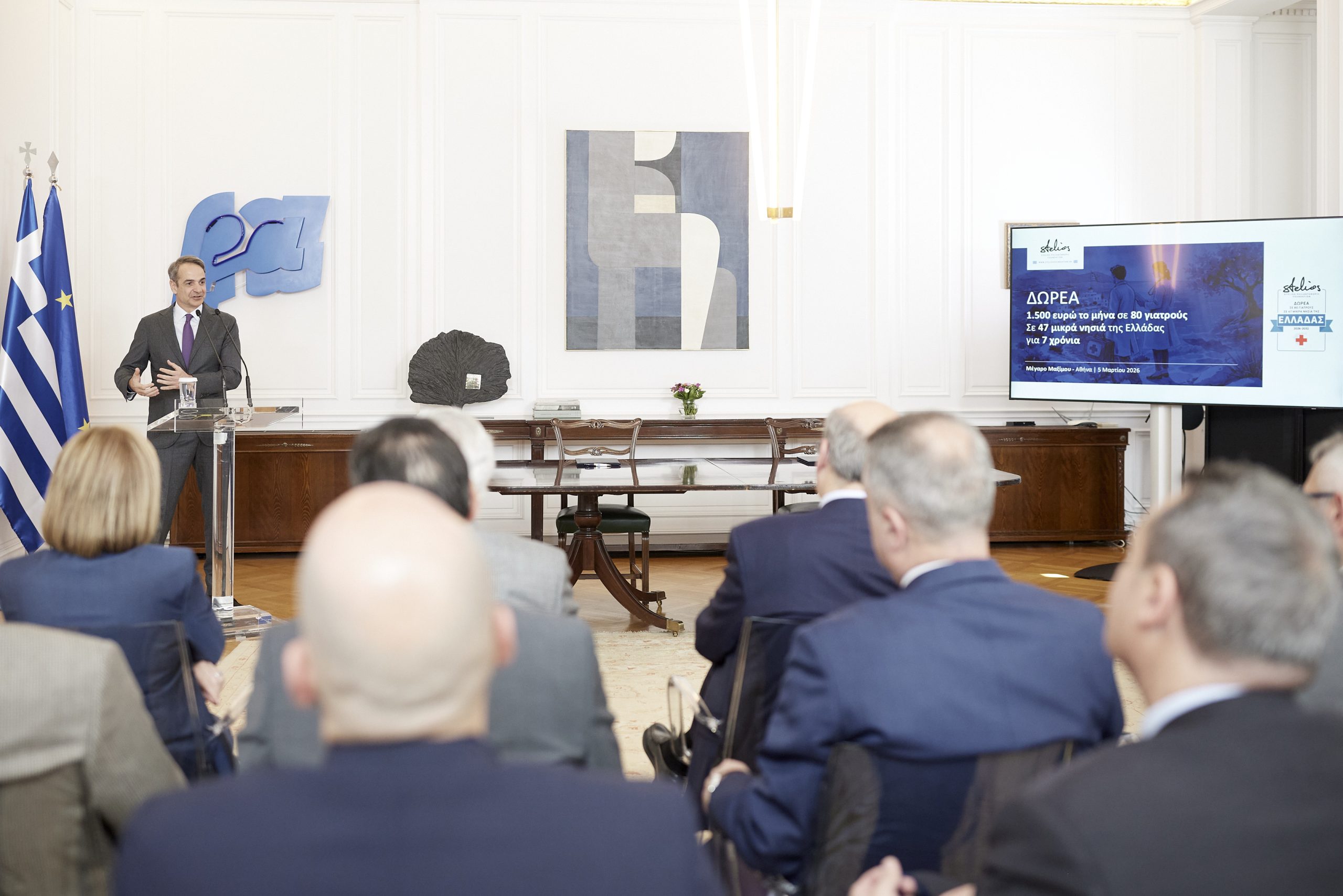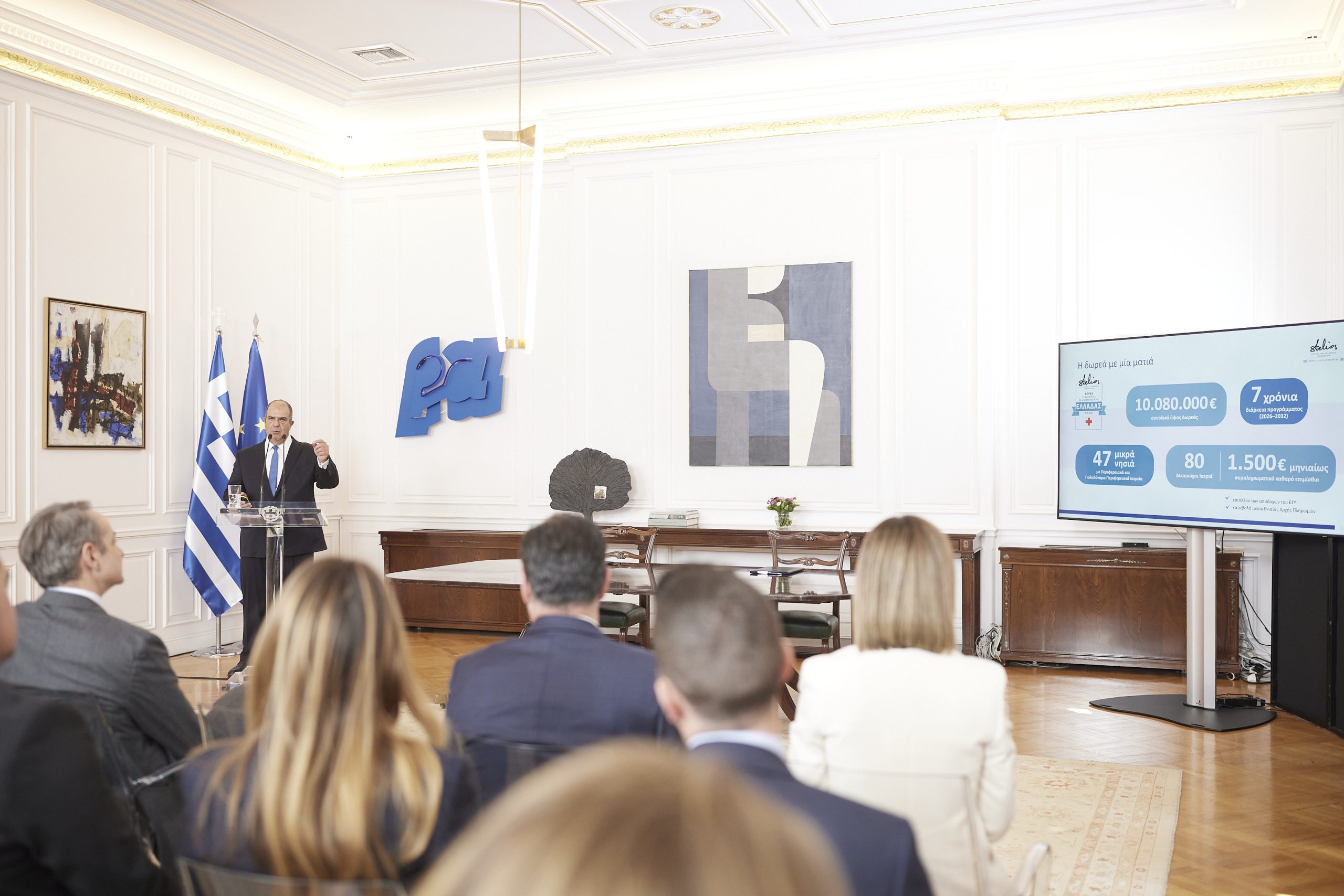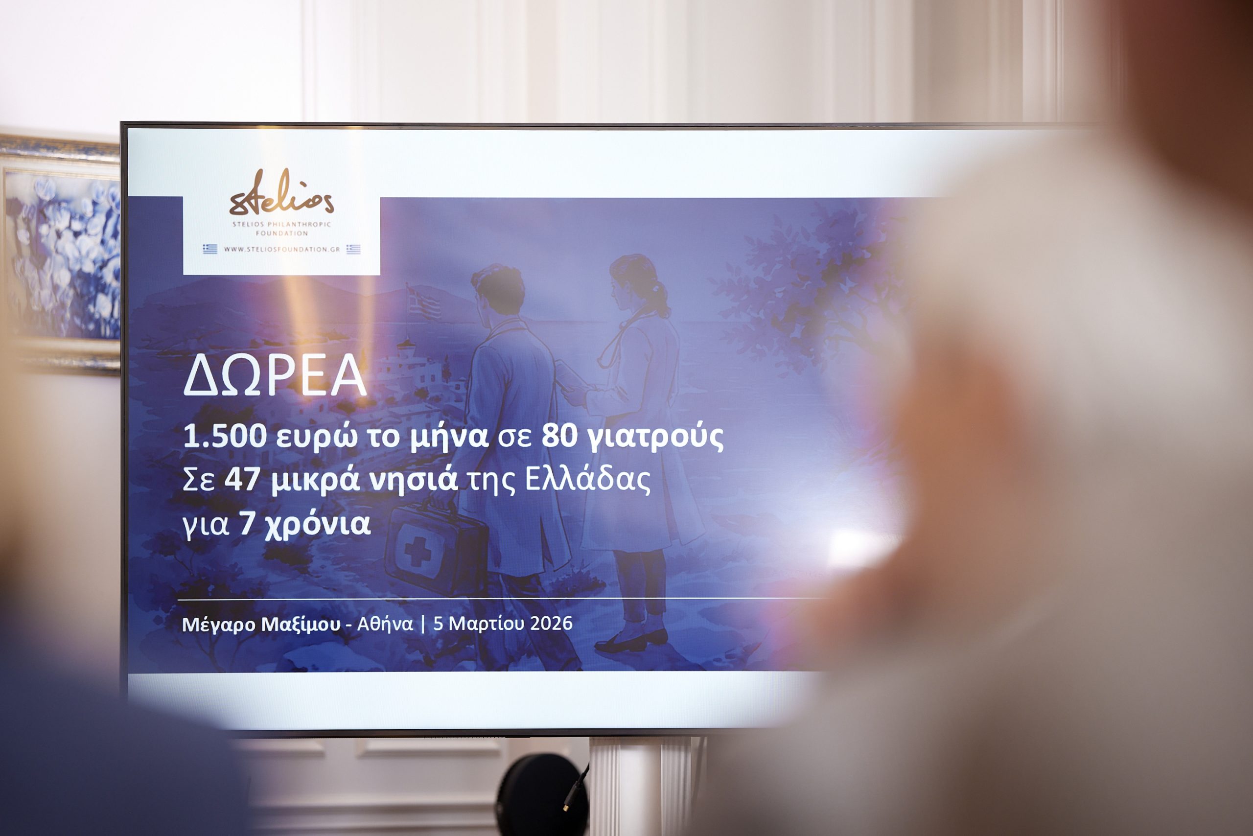 Ο Πρωθυπουργός Κυριάκος Μητσοτάκης παρέστη το μεσημέρι στην εκδήλωση παρουσίασης της δωρεάς του Φιλανθρωπικού Ιδρύματος Στέλιος Χατζηιωάννου, που αποσκοπεί στην ενίσχυση των αποδοχών 80 γιατρών και αγροτικών γιατρών που υπηρετούν με φυσική παρουσία σε 47 μικρά νησιά της Ελλάδας.