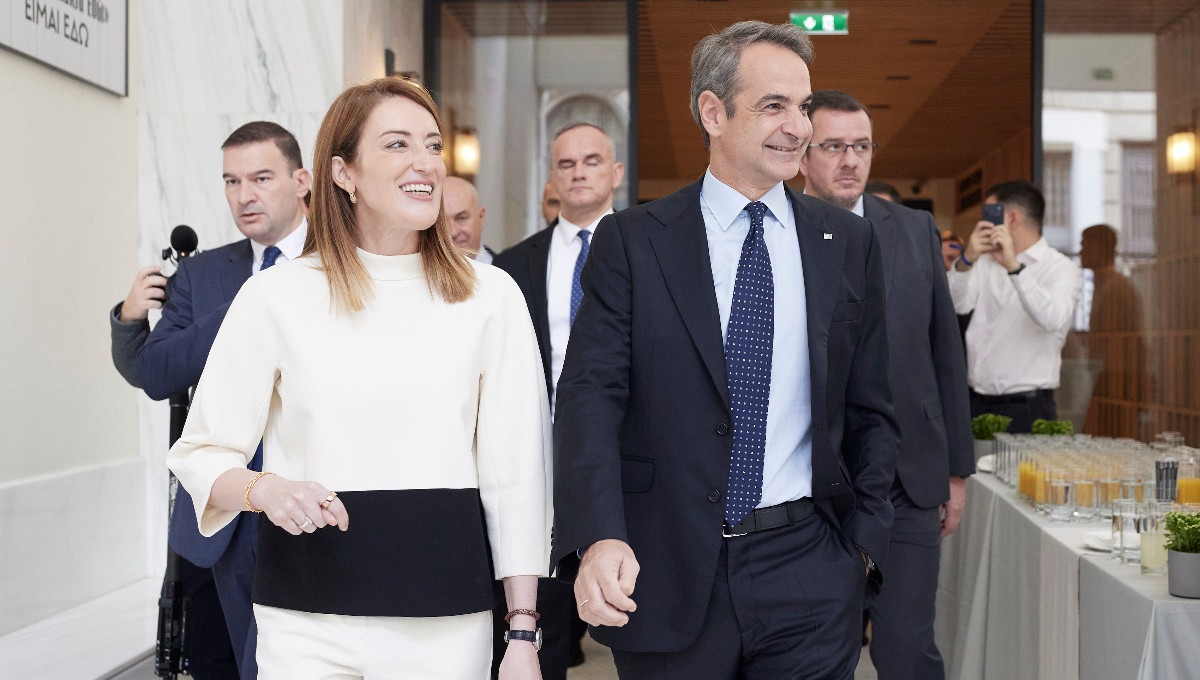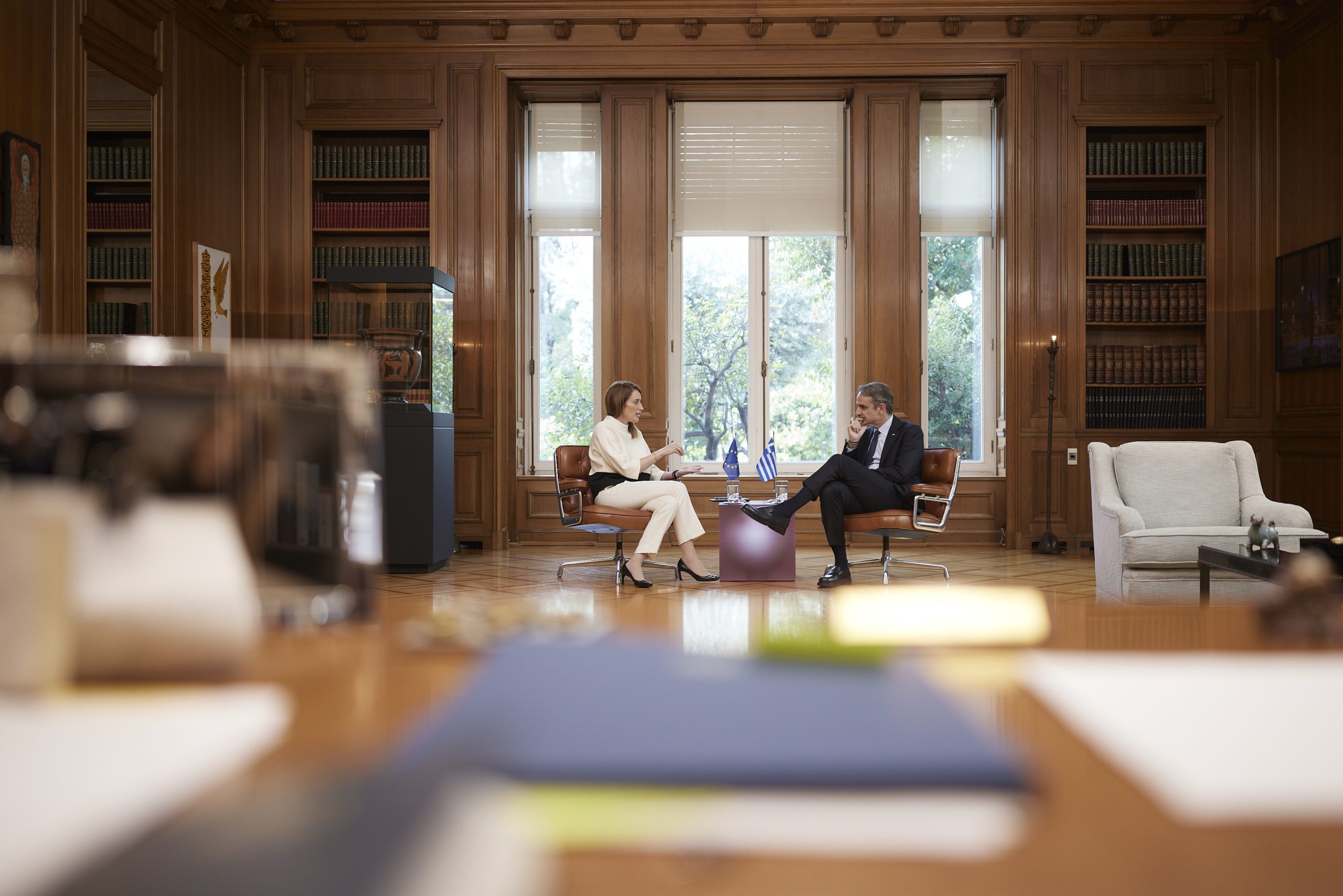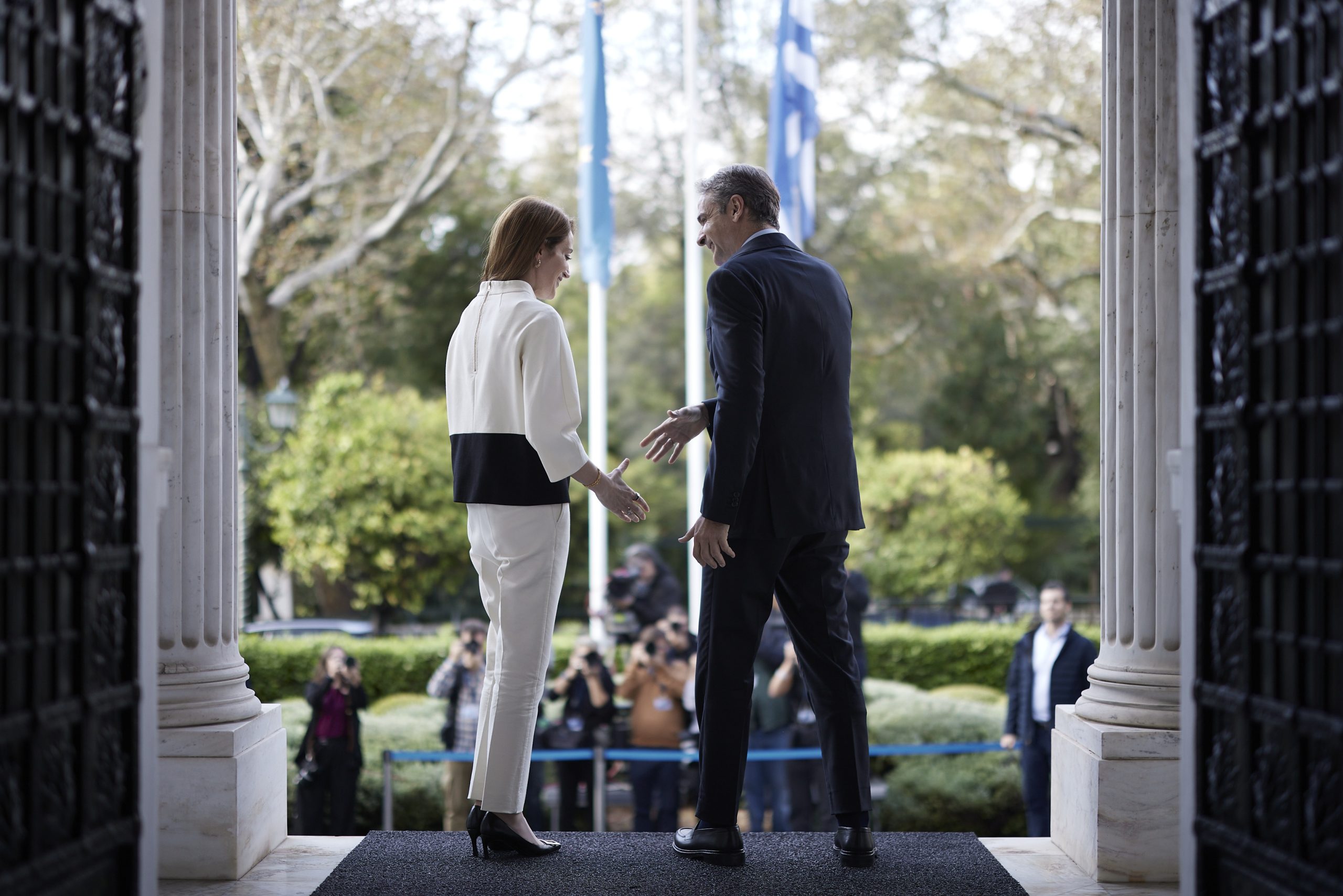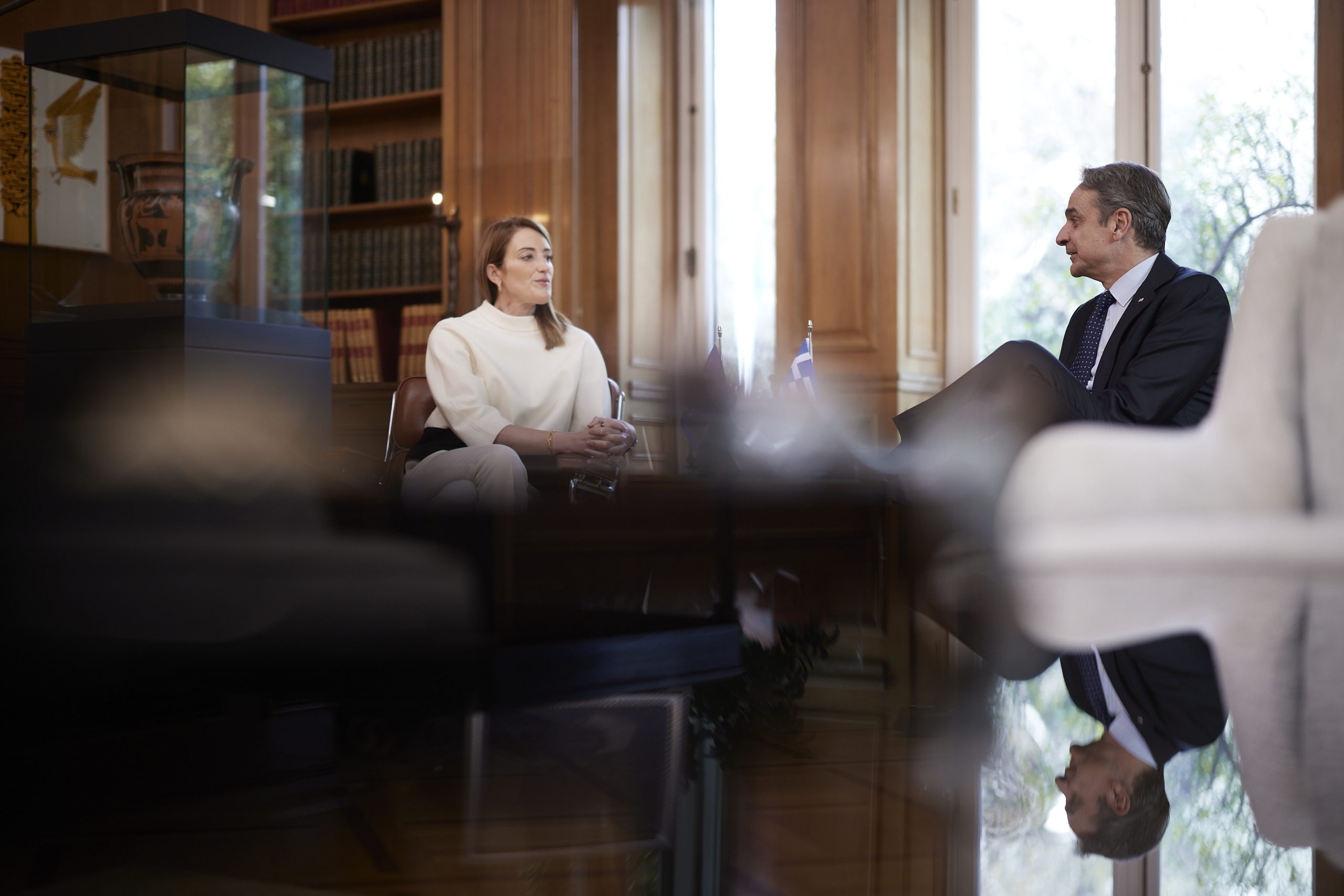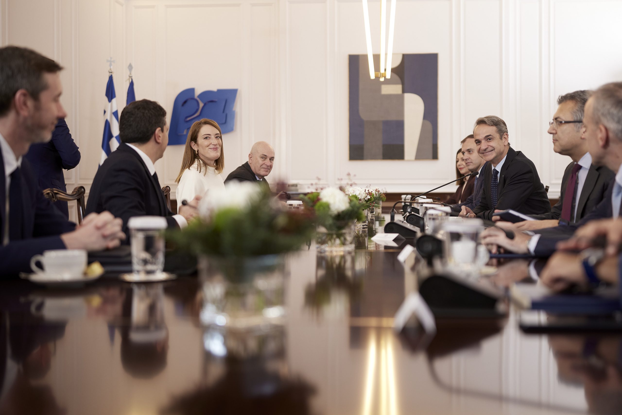 Συνέντευξη Τύπου παραχώρησαν ο πρωθυπουργός Κυριάκος Μητσοτάκης και η πρόεδρος του Ευρωπαϊκού Κοινοβουλίου, Ρομπέρτα Μέτσολα, στο Μέγαρο Μαξίμου μετά τη συνάντηση που είχαν.