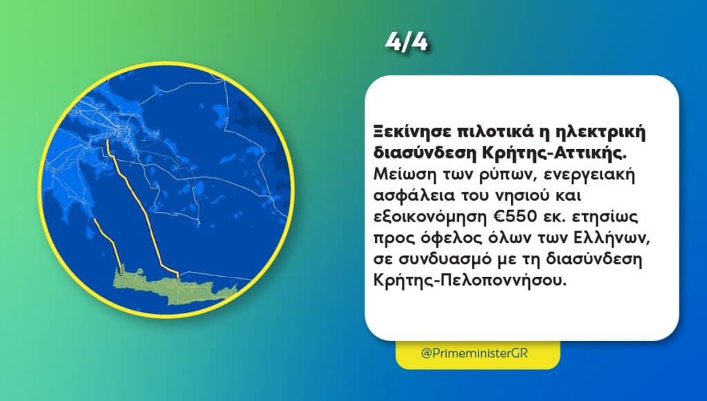 Περνώ τώρα στις πολύ σημαντικές εξελίξεις στον τομέα της ενεργειακής μας ασφάλειας. Ξεκίνησε επιτυχώς τη λειτουργία της η ηλεκτρική διασύνδεση της Κρήτης με το ηπειρωτικό σύστημα, αυτή τη φορά μέσω Αττικής -η πρώτη ήταν μέσω Πελοποννήσου. Έτσι λοιπόν, το νησί απαλλάσσεται οριστικά από τους ρυπογόνους τοπικούς σταθμούς ηλεκτροπαραγωγής με πετρέλαιο, περνώντας σε μια νέα εποχή καθαρής και φθηνότερης ενέργειας. Η απόσυρσή τους σημαίνει και σημαντική οικονομική ελάφρυνση για τους καταναλωτές όλης της χώρας: οι χρεώσεις Υπηρεσιών Κοινής Ωφέλειας στους λογαριασμούς ρεύματος αναμένεται να μειωθούν κατά 300 εκ. ευρώ, ενώ σε συνδυασμό με τη διασύνδεση Κρήτης-Πελοποννήσου, η εξοικονόμηση αναμένεται να φτάσει τα 550 εκ. ευρώ ετησίως.