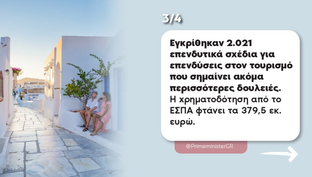 Μέσω ΕΣΠΑ εγκρίθηκαν επίσης άλλα 1.573 επενδυτικά σχέδια για νέες μικρομεσαίες τουριστικές επιχειρήσεις σε 11 Περιφέρειες, με συνολική δημόσια δαπάνη 295,7 εκ. ευρώ. Προηγήθηκαν, στα τέλη Μαΐου, οι εγκρίσεις για Αττική και Νότιο Αιγαίο (448 σχέδια, με 83,7 εκ. ευρώ). Συνολικά λοιπόν, έχουν εγκριθεί 2.021 αιτήσεις, με χρηματοδότηση που ξεπερνά τα 379 εκ. ευρώ από το ΕΣΠΑ. Με τις επενδύσεις αυτές στηρίζουμε τη δραστηριότητα στην περιφέρεια, δημιουργούμε νέες θέσεις εργασίας και ενισχύουμε τον τουρισμό, έναν από τους βασικότερους πυλώνες της οικονομίας μας.
