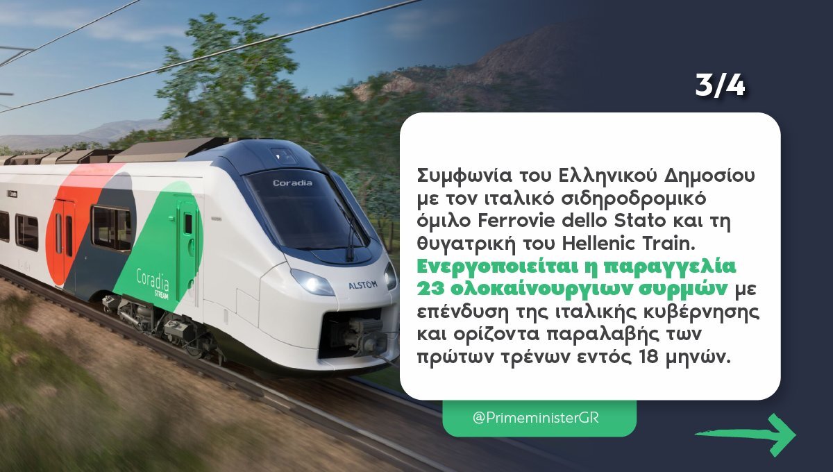 Κυρώθηκε από τη Βουλή των Ελλήνων η νέα συμφωνία του ελληνικού Δημοσίου με τον ιταλικό σιδηροδρομικό όμιλο Ferrovie dello Stato και τη θυγατρική του Hellenic Train, μια ιδιαίτερα θετική εξέλιξη για τον ελληνικό σιδηρόδρομο, με την υπογραφή της οποίας ενεργοποιείται η παραγγελία 23 ολοκαίνουργιων συρμών, με επένδυση της ιταλικής κυβέρνησης και ορίζοντα παραλαβής των πρώτων τρένων εντός 18 μηνών. Πρόκειται για τη μεγαλύτερη επένδυση στις χερσαίες μεταφορές στη χώρα, ύψους 308 εκ. ευρώ. Έτσι, για πρώτη φορά από την περίοδο των Ολυμπιακών Αγώνων, η Ελλάδα αποκτά νέα -και όχι μεταχειρισμένα- τρένα. Με την έλευση των νέων συρμών και την ολοκλήρωση των έργων στον κεντρικό άξονα Αθήνα–Θεσσαλονίκη, ο στόχος είναι η διάρκεια των δρομολογίων να μειωθεί σε κάτω από 3,5 ώρες.