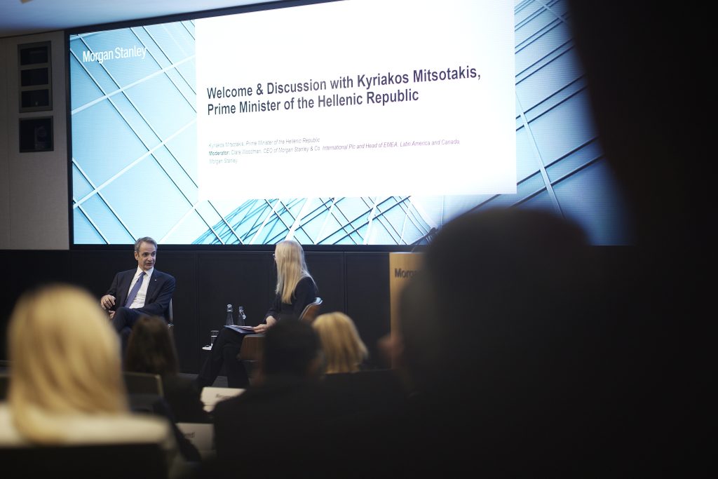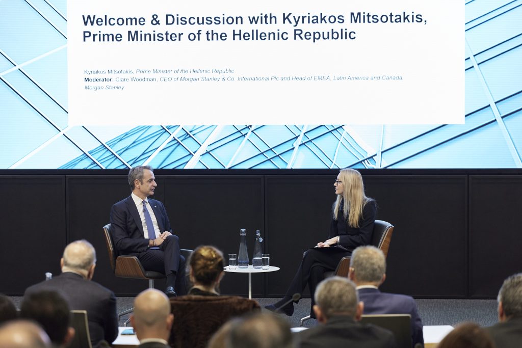 Ο Πρωθυπουργός Κυριάκος Μητσοτάκης συμμετείχε σε συζήτηση με την Clare Woodman, επικεφαλής της Morgan Stanley για την Ευρώπη, τη Μέση Ανατολή και την Αφρική (ΕΜΕΑ), τη Λατινική Αμερική και τον Καναδά, και Διευθύνουσα Σύμβουλο της Morgan Stanley & Co. International, στο πλαίσιο του Ελληνικού Επενδυτικού Συνεδρίου, που συνδιοργανώνουν η Morgan Stanley και το Χρηματιστήριο Αθηνών στο Λονδίνο.