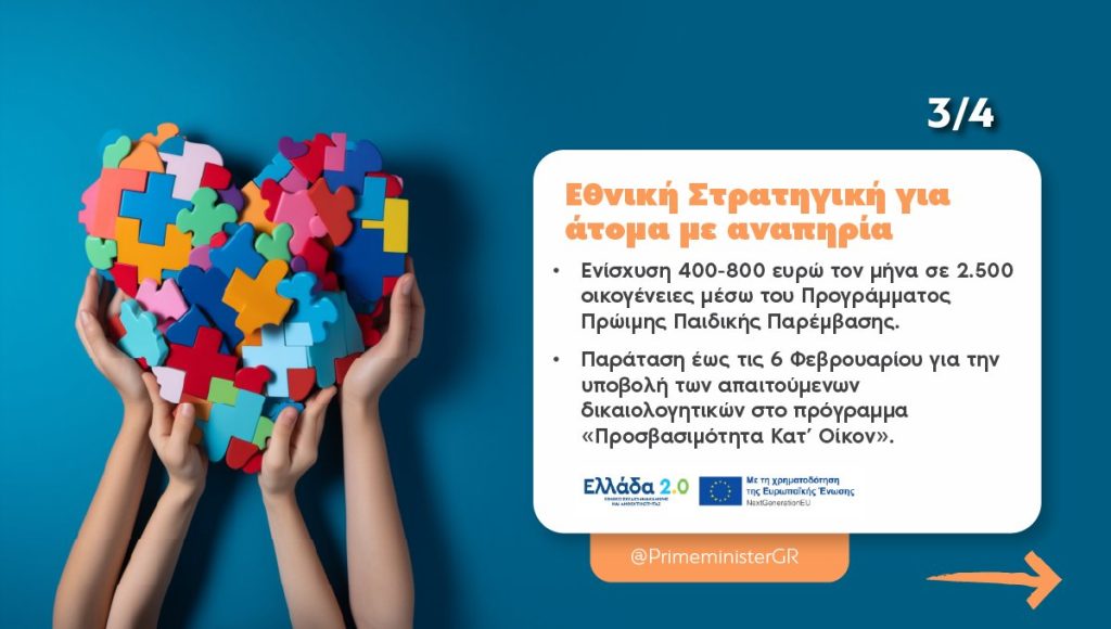 Συνεχίζω με τα νεότερα από δύο σημαντικές πρωτοβουλίες για τα άτομα με αναπηρία, στο πλαίσιο της Εθνικής Στρατηγικής «Μια Ελλάδα με όλους, για όλους». Η πρώτη αφορά το Πρόγραμμα Πρώιμης Παιδικής Παρέμβασης, όπου ξεκίνησε από το Υπουργείο Κοινωνικής Συνοχής και Οικογένειας ξεκίνησε η συμβασιοποίηση δικαιούχων και παρόχων. Ήδη έχει εγκριθεί η πρόσβαση σε 2.500 παιδιά έως 6 ετών με αναπηρία, στο φάσμα του αυτισμού, με αναπτυξιακές διαταραχές ή άλλες νευροαναπτυξιακές δυσκολίες. Για πρώτη φορά, πέρα από τις παροχές του ΕΟΠΥΥ, οι οικογένειες αυτές θα λαμβάνουν ενίσχυση από 400 έως 800 ευρώ τον μήνα για συνεδρίες προσαρμοσμένες στις ανάγκες κάθε παιδιού. Για τη δεύτερη πρωτοβουλία μας, το πρόγραμμα «Προσβασιμότητα Κατ’ Οίκον», δόθηκε παράταση έως τις 6 Φεβρουαρίου για την υποβολή δικαιολογητικών. Θυμίζω ότι το πρόγραμμα απευθύνεται σε άτομα με αναπηρία άνω του 67% και προβλέπει επιδότηση έως 14.500 ευρώ για παρεμβάσεις στην κατοικία ή στον χώρο εργασίας. Με την υποβολή των δικαιολογητικών καταβάλλεται προκαταβολή 50%, ενώ το υπόλοιπο ποσό αποδίδεται μετά την ολοκλήρωση των εργασιών. Μέχρι σήμερα, 1.767 άτομα έχουν ήδη λάβει την προκαταβολή.