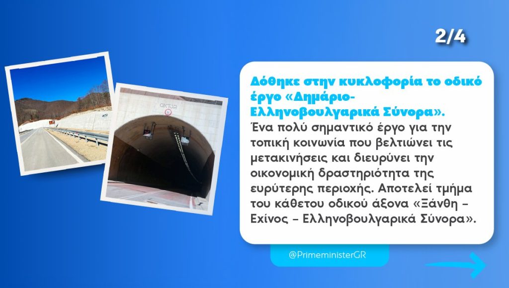 Το πρώτο είναι η ολοκλήρωση του οδικού άξονα από το Δημάριο της Ξάνθης έως τα ελληνοβουλγαρικά σύνορα. Ένα έργο ιδιαίτερης σημασίας για την τοπική κοινωνία, καθώς βελτιώνει τις μετακινήσεις και διευρύνει την οικονομική δραστηριότητα της ευρύτερης περιοχής. Ο δρόμος αυτός αποτελεί τμήμα του κάθετου άξονα «Ξάνθη-Εχίνος-Ελληνοβουλγαρικά Σύνορα» και εντάσσεται στο διευρωπαϊκό δίκτυο μεταφορών, αποτελώντας ένα απτό παράδειγμα της επιτυχημένης συνεργασίας με τους βόρειους γείτονές μας, τη Βουλγαρία και τη Ρουμανία, στον διάδρομο Βαλτική-Μαύρη Θάλασσα-Αιγαίο.