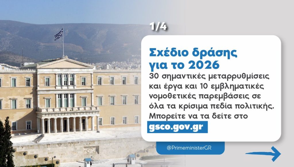Η δουλειά μας είναι μία: να προχωράμε με σχέδιο, ενισχύοντας τη σταθερότητα της πατρίδας μας. Και ο δρόμος είναι ένας: μεταρρυθμίσεις. Αυτό άλλωστε αποτυπώνεται και στον προγραμματισμό της κυβέρνησης για το 2026, που παρουσιάστηκε αυτήν την εβδομάδα. https://t.co/mQQuiBKSPy pic.twitter.com/qoXAz6zuc6