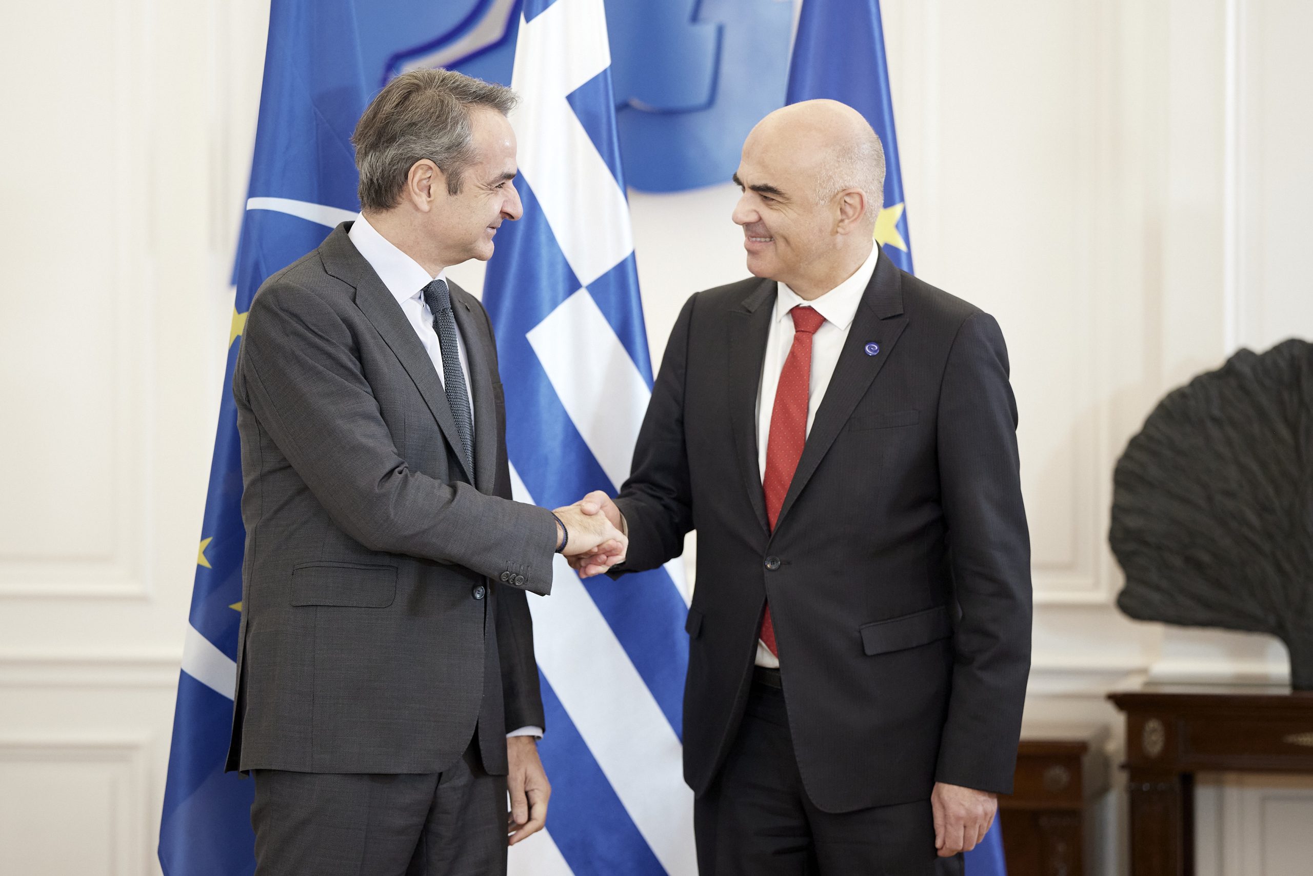 Alain Berset: Σας ευχαριστώ θερμά, κ. Πρωθυπουργέ, γι’ αυτή την εγκάρδια υποδοχή σήμερα εδώ στην Αθήνα. Είναι τεράστια χαρά και τιμή που έχω την ευκαιρία να σας συναντήσω ξανά.