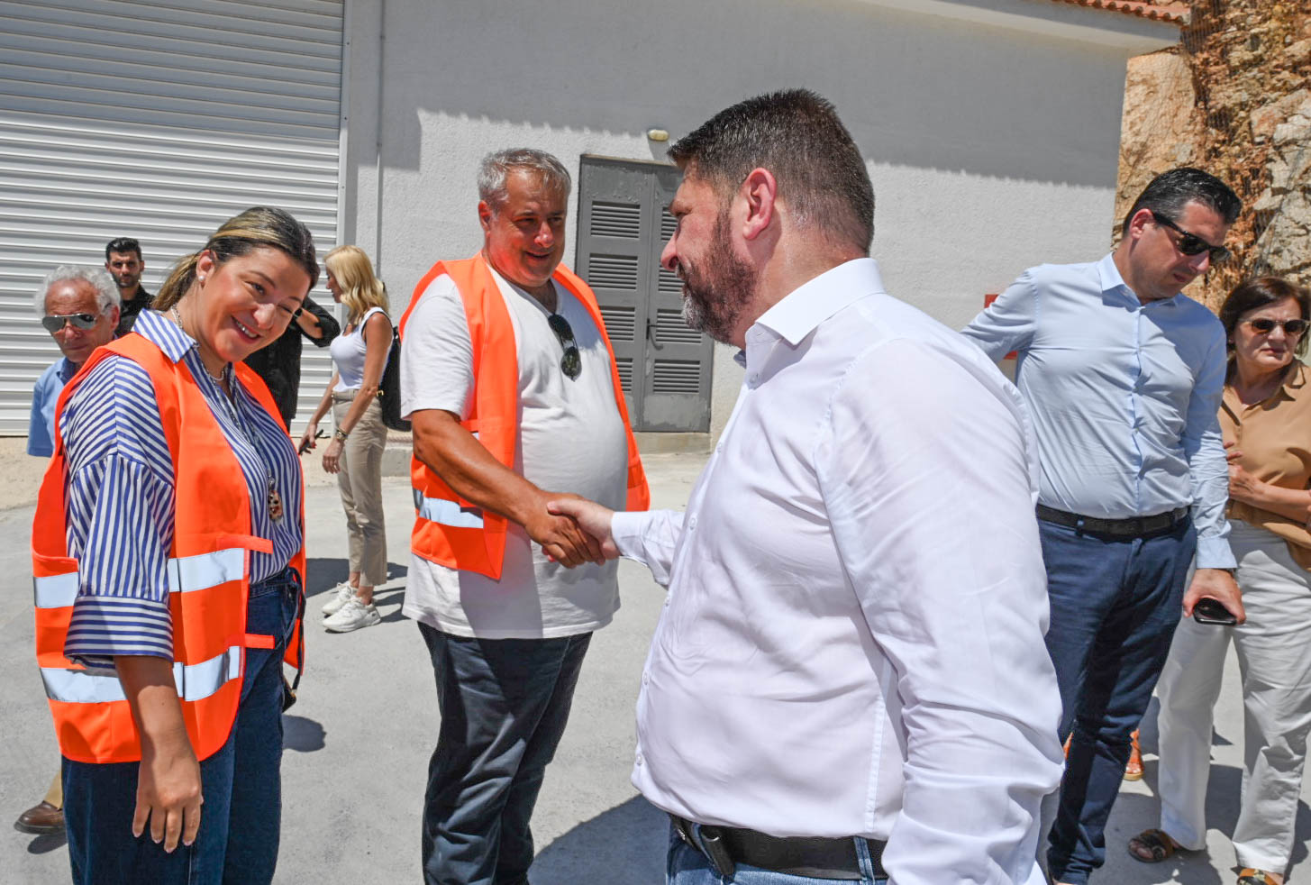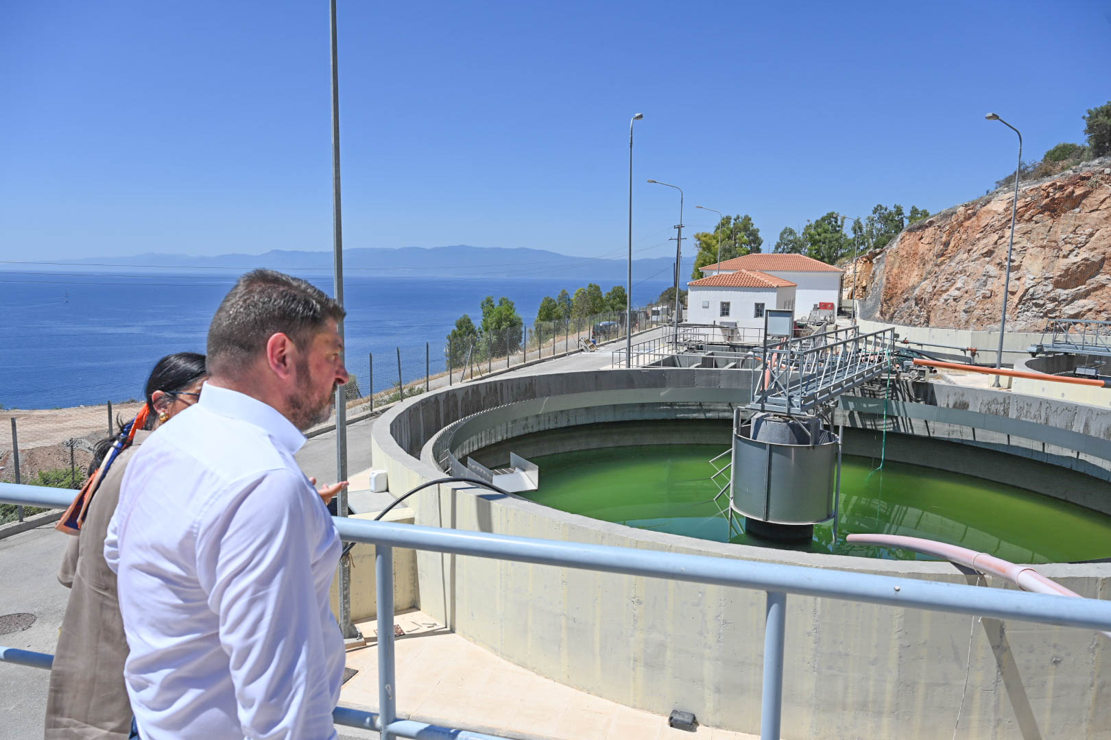 Εν συνεχεία, ο Περιφερειάρχης βρέθηκε στο εργοτάξιο και στον χώρο που πραγματοποιείται η κατασκευή Δικτύου Ακαθάρτων και Καθαρισμού Λυμάτων. Το έργο βρίσκεται σε προχωρημένο στάδιο υλοποίησης, καθώς έχει ήδη ολοκληρωθεί η κατασκευή και η θωράκιση του υποθαλάσσιου αγωγού, η κατασκευή των αντλιοστασίων, καθώς και μεγάλο μέρος της τοποθέτησης των ηλεκτρομηχανικών εγκαταστάσεων.