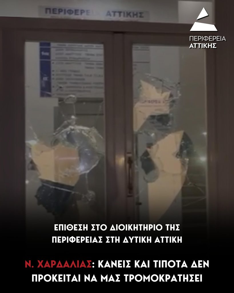 “Κανείς και τίποτα δεν πρόκειται να μας τρομοκρατήσει, κανείς και τίποτα δεν πρόκειται να ανακόψει ούτε στο ελάχιστο τις προσπάθειες που κάνει η διοίκησή μας για να βελτιώσει την ποιότητα ζωής όλων των πολιτών, σε κάθε μία από τις 66 ξεχωριστές γειτονιές της Αττικής μας” δήλωσε σχετικά ο περιφερειάρχης Αττικής Νίκος Χαρδαλιάς καταδικάζοντας απερίφραστα την βίαιη επίθεση. “Η αυτοδιοίκηση είναι ο θεσμός που βρίσκεται πιο κοντά από κάθε άλλον στους πολίτες, στις ανάγκες, τις προσδοκίες και τις ιδιαίτερες δυνατότητες κάθε τοπικής κοινωνίας. Η επίθεση στην αυτοδιοίκηση είναι επίθεση στην ίδια την κοινωνία των πολιτών, είναι ευθεία επίθεση στην καρδιά της δημοκρατίας. Οι ‘γνωστοί άγνωστοι’, κρυμμένοι πίσω από τις κουκούλες και τα κράνη τους, επιλέγουν να στρέφονται εναντίον των δημοκρατικών ελευθεριών, κινούμενοι στο σκοτάδι, επιβάλλοντας με τη βία και το μίσος τις αντικοινωνικές τους θέσεις. Εμείς, επιλέγουμε να απαντάμε με το έργο μας, δίνοντας στο φως της ημέρας τον διαρκή αγώνα του αυτονόητου, για όλους τους πολίτες, με την κοινωνία στο πλευρό μας. Έτσι θα συνεχίσουμε, χωρίς φόβο, χωρίς να κάνουμε πίσω ούτε βήμα από αυτό που υποσχεθήκαμε στους πολίτες της Αττικής. Και αυτή την υπόσχεσή μας θα την τηρήσουμε μέχρι κεραίας. Συνεχίζουμε, πάντα δυνατά, για να πάμε την Αττική μπροστά”.