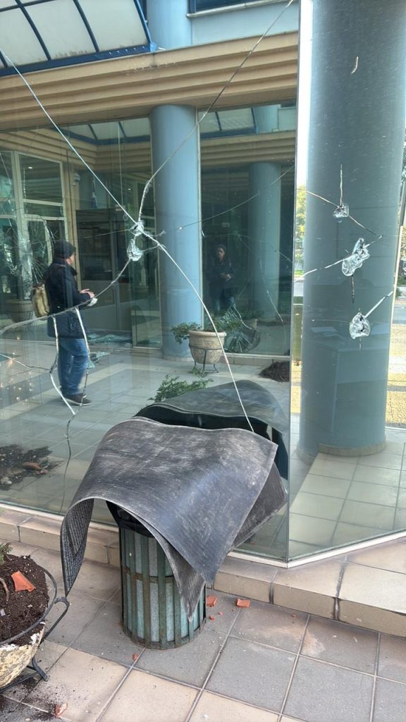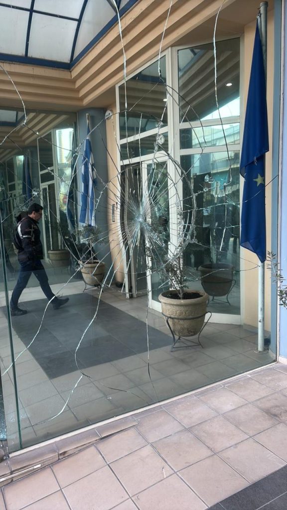 Συγκεκριμένα, τέσσερις νεαροί με καλυμμένα τα πρόσωπα και εφοδιασμένοι με κράνη, λοστούς και κοντάρια, κατέστρεψαν τις γλάστρες στον εξωτερικό χώρο του κτήριου. Στη συνέχεια έσπασαν τους υαλοπίνακες του ισογείου και προέβησαν σε βανδαλισμό των γραφείων. Το πλήρωμα διερχόμενου περιπολικού της ΕΛΑΣ, συνέλαβε τον έναν από τους δράστες, ενώ οι υπόλοιποι τρεις διεφυγαν και καταζητούνται.