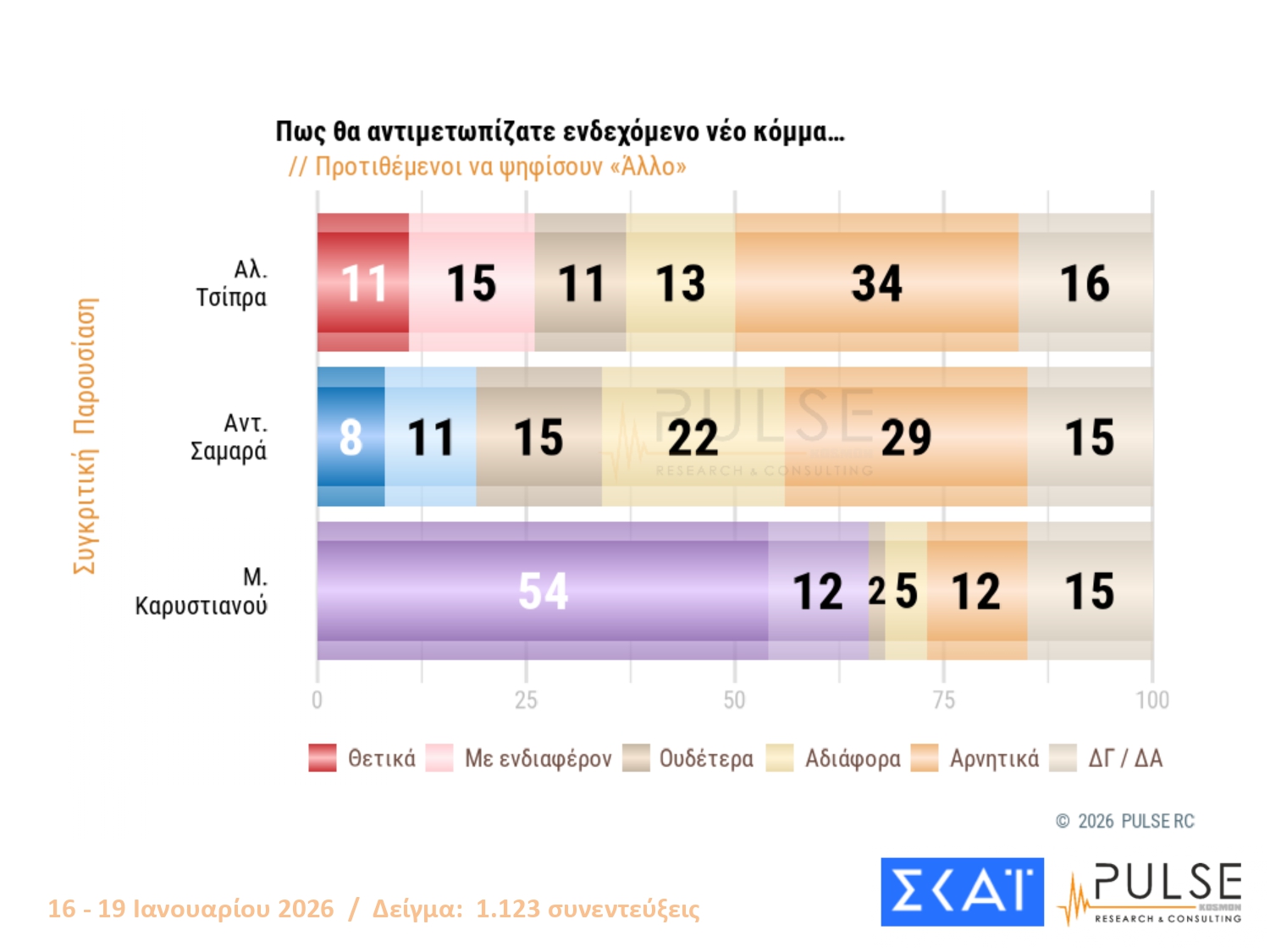 Στο 10,5% φτάνει το ποσοστό όσων επιλέγουν «άλλο κόμμα», αυξημένο από το 9,7% του Δεκεμβρίου, κάτι που συνδέεται με την αναμονή για τα υπό ίδρυση κόμματα της Μαρίας Καρυστιανού και του Αλέξη Τσίπρα. Από αυτούς, το 54% βλέπει θετικά το κόμμα Καρυστιανού και το 11% το κόμμα Τσίπρα.