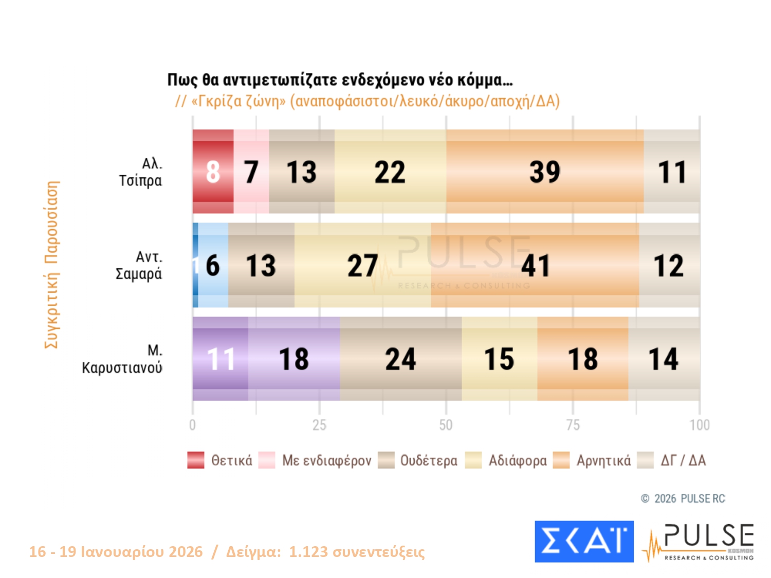 Η διείσδυση των δύο νέων σχημάτων στους ψηφοφόρους της ΝΔ είναι πολύ χαμηλή. Αντίθετα, μεταξύ των ψηφοφόρων του ΠΑΣΟΚ, το 12% βλέπει θετικά το κόμμα Καρυστιανού και το 9% το κόμμα Τσίπρα. Η Καρυστιανού συγκεντρώνει 20% θετικής γνώμης στους ψηφοφόρους της Πλεύσης και 11% στη λεγόμενη «γκρίζα ζώνη» που φτάνει στο 16,5%.