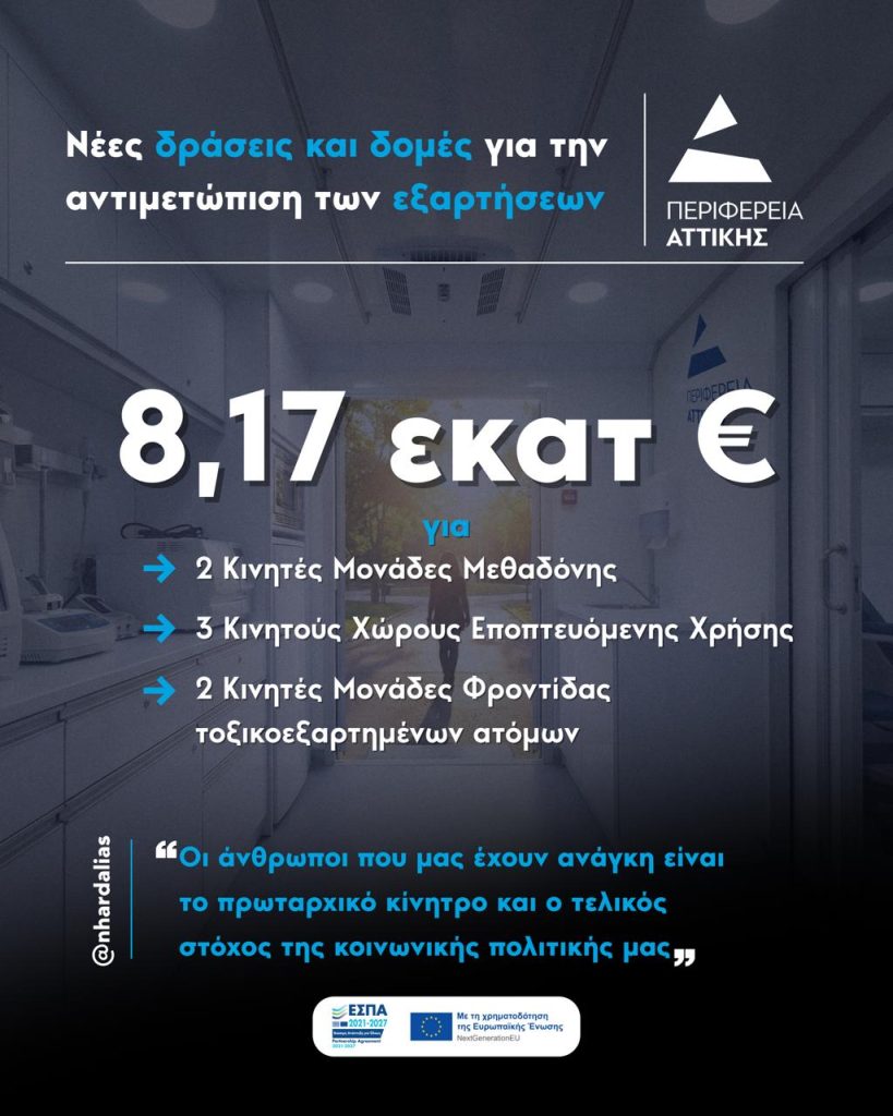 Στη δημιουργία δύο Κινητών Μονάδων Μεθαδόνης, τριών Κινητών Χώρων Εποπτευόμενης Χρήσης και δύο Κινητών Μονάδων Φροντίδας τοξικοεξαρτημένων ατόμων, με συνολικό προϋπολογισμό 8,17 εκατ. ευρώ, προχωρά η Περιφέρεια Αττικής, μετά την υπογραφή από τον Περιφερειάρχη Νίκο Χαρδαλιά της σχετικής απόφασης ένταξης της Πράξης στο Πρόγραμμα «Αττική 2021-2027».