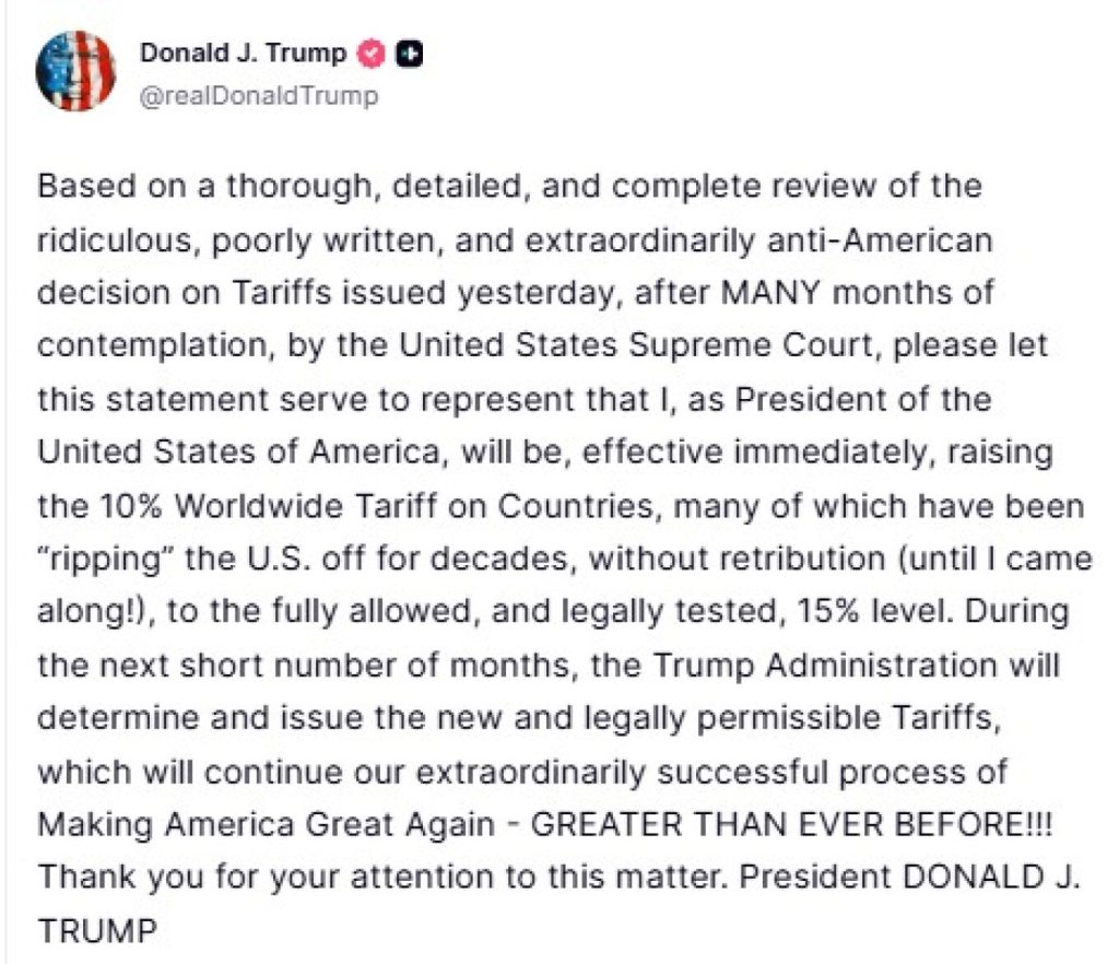 «Με βάση μια διεξοδική, λεπτομερή και πλήρη ανασκόπηση της γελοίας, κακογραμμένης και εξαιρετικά αντιαμερικανικής απόφασης σχετικά με τους δασμούς που εκδόθηκε χθες, μετά από ΠΟΛΛΟΥΣ μήνες σκέψης, από το Ανώτατο Δικαστήριο των Ηνωμένων Πολιτειών, παρακαλώ να θεωρηθεί η παρούσα δήλωση ως δήλωση ότι εγώ, ως Πρόεδρος των Ηνωμένων Πολιτειών της Αμερικής, θα αυξήσω, με άμεση ισχύ, τον παγκόσμιο δασμό 10% σε χώρες, πολλές από τις οποίες «εκμεταλλεύονταν» τις Ηνωμένες Πολιτείες για δεκαετίες, χωρίς αντίποινα (μέχρι που ήρθα εγώ!), στο πλήρως επιτρεπόμενο και νομικά ελεγμένο επίπεδο του 15%. Κατά τη διάρκεια των επόμενων λίγων μηνών, η κυβέρνηση Τραμπ θα καθορίσει και θα εκδώσει τους νέους και νομικά επιτρεπόμενους δασμούς, οι οποίοι θα συνεχίσουν την εξαιρετικά επιτυχημένη διαδικασία μας για να κάνουμε την Αμερική ξανά μεγάλη – ΜΕΓΑΛΥΤΕΡΗ ΑΠΟ ΠΟΤΕ!!! Σας ευχαριστώ για την προσοχή σας σε αυτό το θέμα. Πρόεδρος ΝΤΟΝΑΛΝΤ ΤΡΑΜΠ».