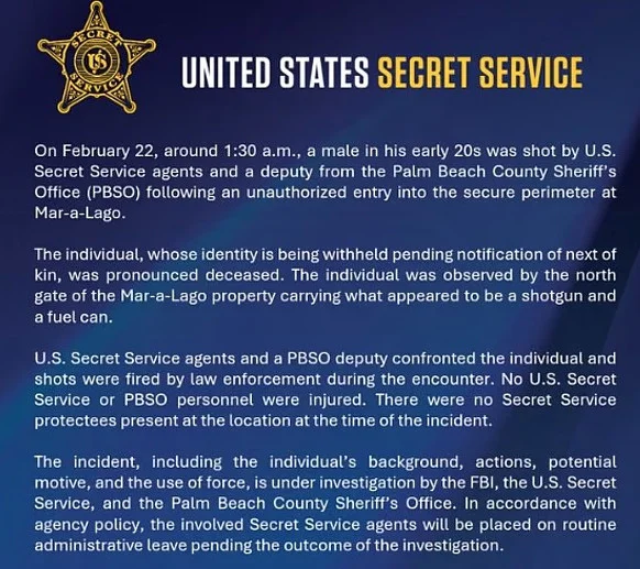 Η Μυστική Υπηρεσία των Ηνωμένων Πολιτειών ανακοίνωσε ότι πυροβόλησε και σκότωσε έναν οπλισμένο άνδρα, μετά την είσοδό του στην ασφαλή περίμετρο του Μαρ α Λάγκο, του θέρετρου του προέδρου Ντόναλντ Τραμπ στο Παλμ Μπιτς της Φλόριντα.