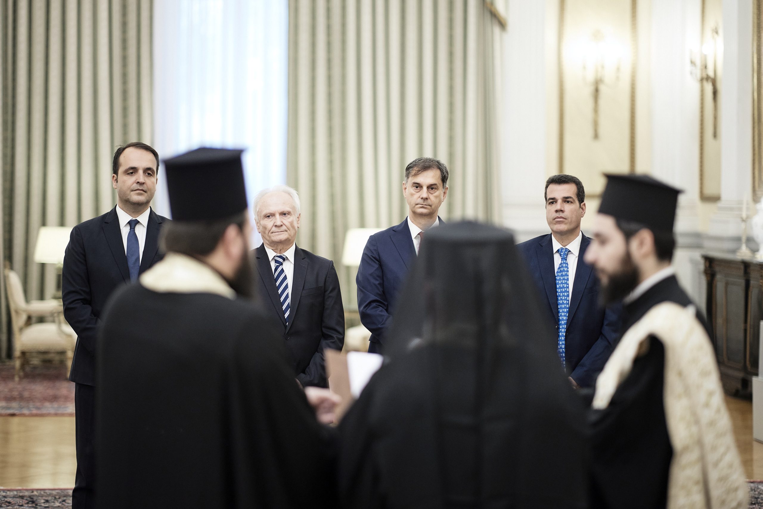 Μετά την ορκωμοσία και τις υπογραφές για την ανάληψη των καθηκόντων τους, ο νέος υπουργός και οι τρεις υφυπουργοί είχαν σύντομη συνομιλία με τον Κυριάκο Μητσοτάκη.