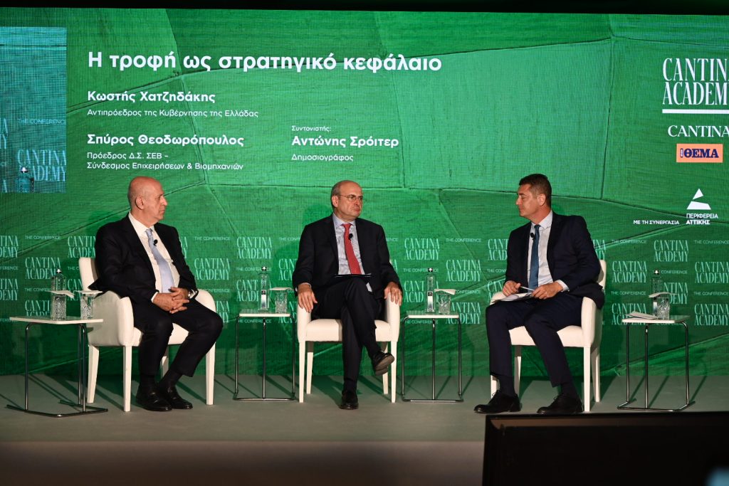 Τους στρατηγικούς άξονες της αγροδιατροφικής πολιτικής που υλοποιεί η Περιφέρεια Αττικής ως βασικό εργαλείο για την περιφερειακή ανάπτυξη, την κοινωνική συνοχή και την ενίσχυση της εξωστρέφειας, παρουσίασε ο Περιφερειάρχης Αττικής, κ. Νίκος Χαρδαλιάς, παρουσία του Αντιπροέδρου της Κυβέρνησης Κωστή Χατζηδάκη, του Προέδρου του ΣΕΒ Σπύρου Θεοδωρόπουλου και δεκάδων στελεχών του αγροδιατροφικού τομέα και του λιανεμπορίου, απευθύνοντας χαιρετισμό στο συνέδριο «Cantina Academy – Διασφαλίζοντας το μέλλον της τροφής». Η εκδήλωση πραγματοποιήθηκε στην Αίγλη του Ζαππείου από το «Πρώτο Θέμα», σε συνεργασία της Περιφέρειας Αττικής.