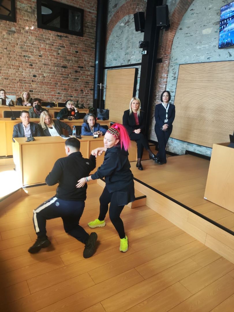 Για τη βία στην ελληνική κοινωνία μίλησε ο Δρ. Κωνσταντίνος Μπέης, καθηγητής ΤΕΦΑΑ του ΑΠΘ. Αναφερόμενος στην επίδειξη τεχνικών αυτοάμυνας, που ακολούθησε, ο κ. Μπέης σημείωσε ότι «μέσα από την επίδειξη αυτή θέλουμε να καταστήσουμε ξεκάθαρο ότι η γυναίκα δεν είναι απροστάτευτη, αλλά υπάρχουν πρακτικές ασκήσεις και τρόποι με τους οποίους μπορεί να αμυνθεί, να αιφνιδιάσει αυτόν που της επιτίθεται, να κερδίσει χρόνο και να αποφύγει την κακή εις βάρος της εξέλιξη. Είναι θέμα τεχνικής, όχι δύναμης».