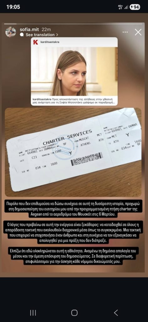 «Παρόλο που δεν επιθυμούσα να δώσω συνέχεια σε αυτή τη δυσάρεστη ιστορία, προχωρώ στη δημοσιοποίηση του εισιτηρίου μου από την προγραμματισμένη πτήση charter της Aegean από το αεροδρόμιο του Μουσκάτ στις 6 Μαρτίου.