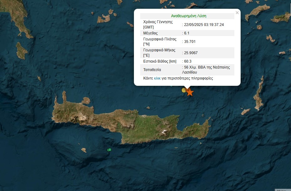 Ισχυρός σεισμός μεγέθους 6,1 βαθμών της κλίμακας Ρίχτερ σημειώθηκε στις 06:19 στα ανοιχτά της Κρήτης.