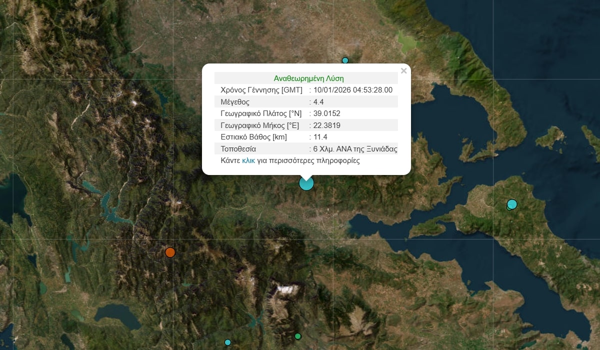 Σεισμική δόνηση 4,4 βαθμών της κλίμακας Ρίχτερ σημειώθηκε στις 06:53, σε απόσταση 164 χλμ. βορειοδυτικά της Αθήνας.