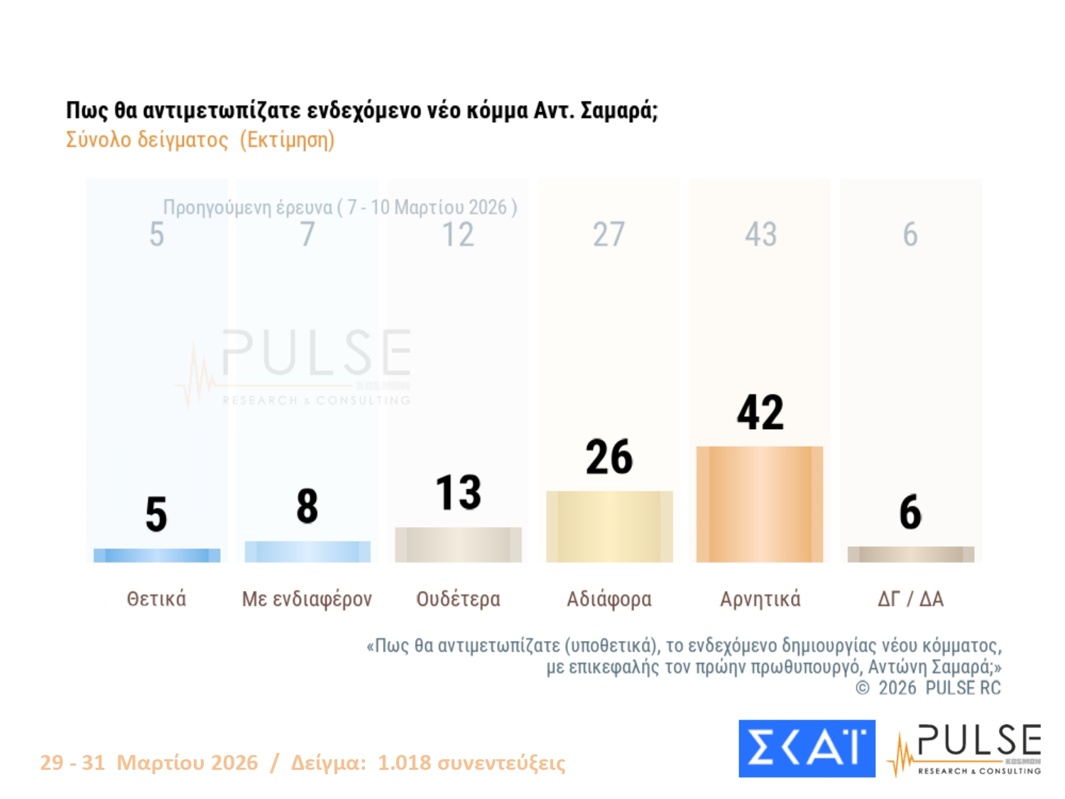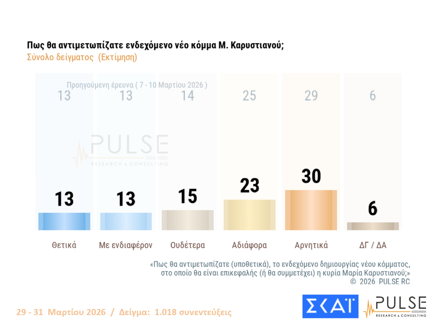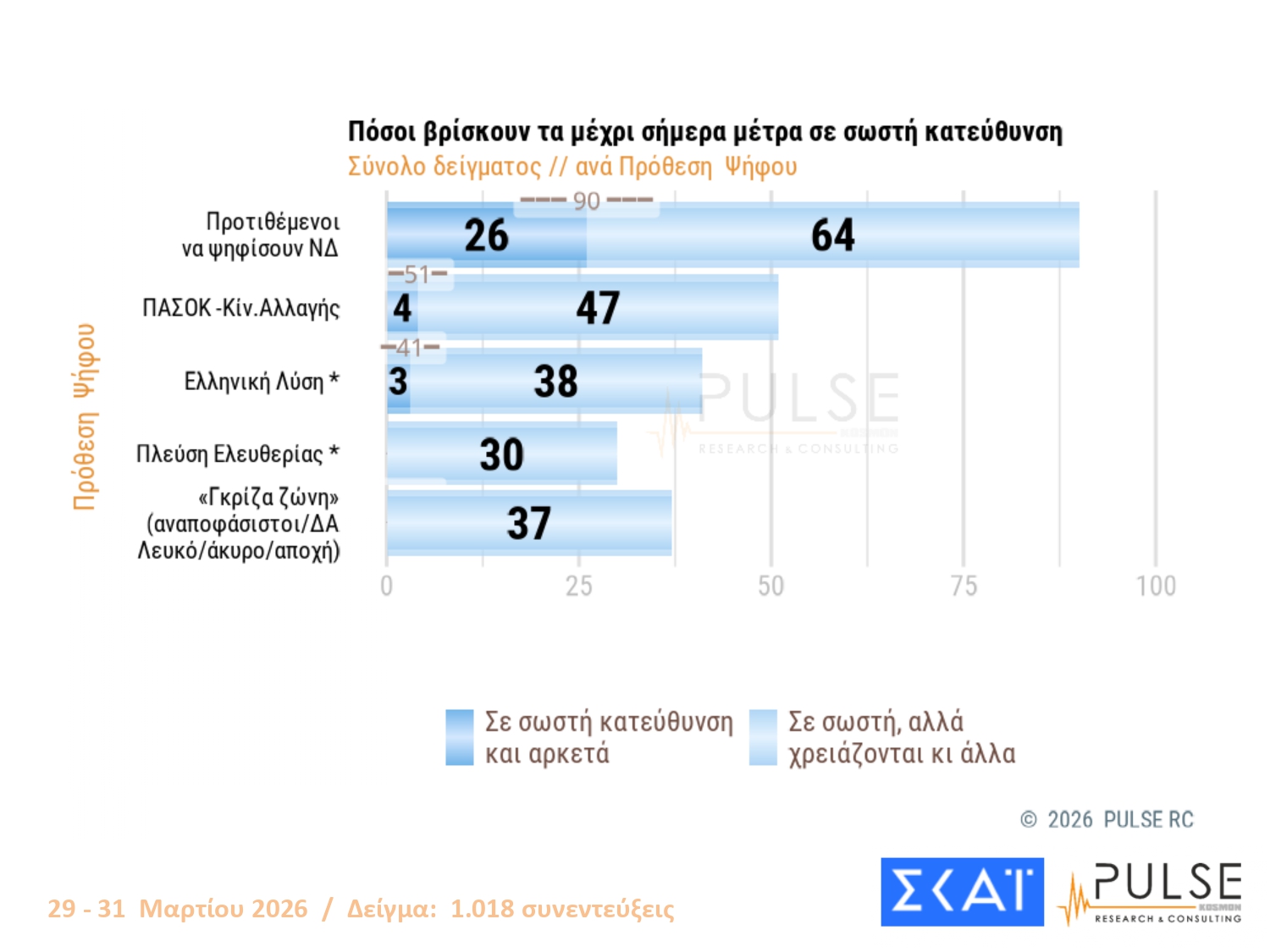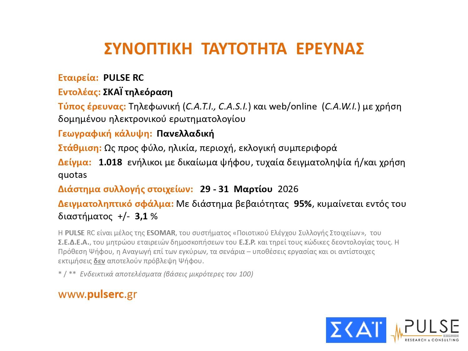 Σε μια περίοδο έντονης πολιτικής και διεθνούς ρευστότητας, η νέα δημοσκόπηση της Pulse RC για τον ΣΚΑΪ αποτυπώνει σημαντικό προβάδισμα για τη Νέα Δημοκρατία στην πρόθεση ψήφου. Η έρευνα πραγματοποιήθηκε το διάστημα 29–31 Μαρτίου 2026 σε δείγμα 1.018 πολιτών και καταγράφει σαφή υπεροχή του κυβερνώντος κόμματος έναντι των υπόλοιπων πολιτικών σχηματισμών.