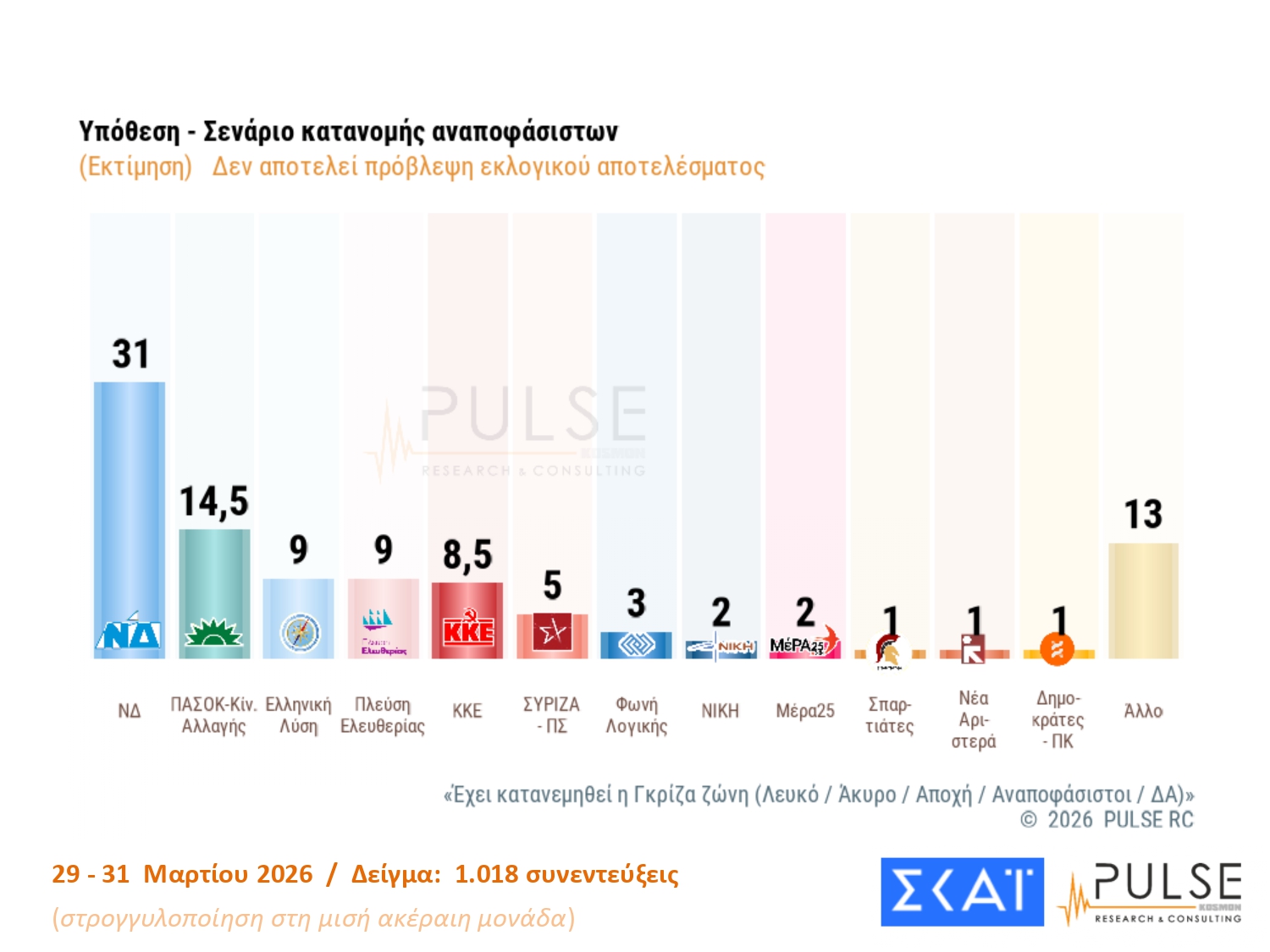 Σταθερά πρώτη η ΝΔ στη νέα δημοσκόπηση της Pulse με 31%, διατηρεί μεγάλη διαφορά από το ΠΑΣΟΚ