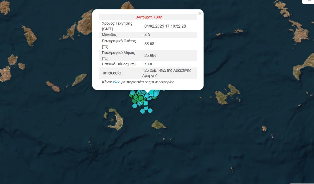 Ο σεισμός έγινε 25 Χλμ. ΝΝΔ της Αρκεσίνης Αμοργού και είχε εστιακό βάθος τα 10 χλμ.