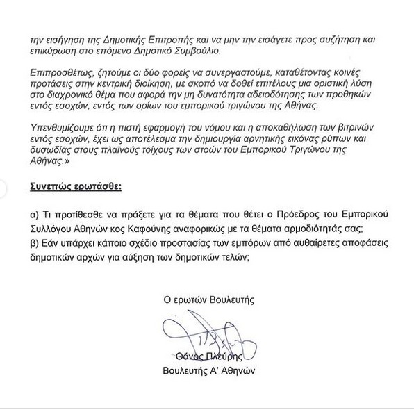 Ο κ. Πλεύρης, κοινοποιεί την επιστολή του προέδρου του Εμπορικού Συλλόγου Αθηνών προς τον δήμαρχο Αθηναίων με την οποία «διαμαρτύρεται δικαίως» -όπως αναφέρει ο βουλευτής της ΝΔ- για την πολιτική αύξησης δημοτικών τελών 10% σε σειρά δραστηριοτήτων που πλήττει τους μικρομεσαίους εμπόρους της Αθήνας. Προσθέτει ότι η αύξηση αυτή έγινε αυθαίρετα, χωρίς να έχει προηγηθεί οποιοσδήποτε διάλογος, ενώ παράλληλα θέτει μία σειρά ζητήματα αναφορικώς με τη δυνατότητα αδειοδότησης των προθηκών εντός των ορίων του εμπορικού τριγώνου της Αθήνας.