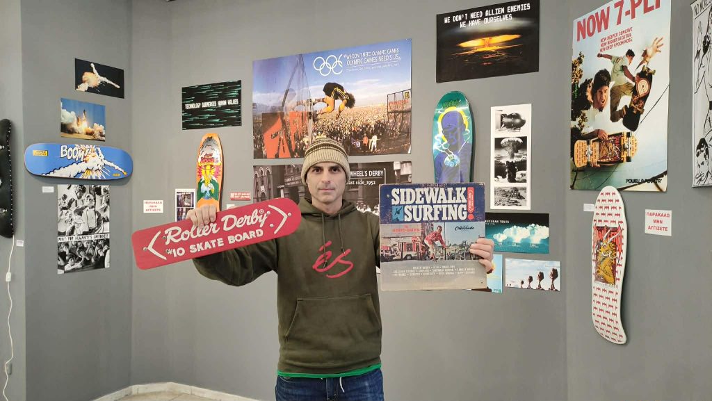«Η έκθεσή μας είναι η πρώτη που ξεκίνησε στην Ελλάδα, με σκοπό να προσεγγίσουμε τον κόσμο και να δείξουμε μια διαφορετική εικόνα για το σκέιτ. Για το πάθος μας, που έχει εξελιχθεί σε μία από τις μεγαλύτερες συλλογές της Ευρώπης. Εκτός από τα καλλιτεχνικά και εικαστικά κομμάτια, παρουσιάζουμε κείμενα και φωτογραφίες, αφηγούμαστε την ιστορία μέσα από την τέχνη. Δεν ξέρουμε, αν ο πρώτος καταγεγραμμένος σκέιτμπορντερ ήταν Θεσσαλονικιός, αλλά σίγουρα η πόλη έχει πρωτιές. Μιλάμε για την πρώτη οργανωμένη ομάδα, που λειτουργούσε σαν σύλλογος, με καταστατικό, αγώνες, γραφείο, σφραγίδες και κατάστημα. Για το πρώτο skate park στην Ευρώπη, στου Φωκά, που αποτέλεσε σημείο αναφοράς και έχει μια μεγάλη ιστορία», εξηγεί.